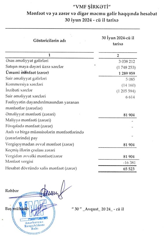 Saatların, zərgərlik məmulatlarının topdan və pərakəndə satışı, həmçinin onlara servis xidmətlərinin göstərilməsi fəaliyyətləri ilə məşğul olan "VMF" şirkəti 2024-cü ilin birinci yarısını (yanvar-sentyabr) 66 min manat xalis mənfəət ilə başa vurub.