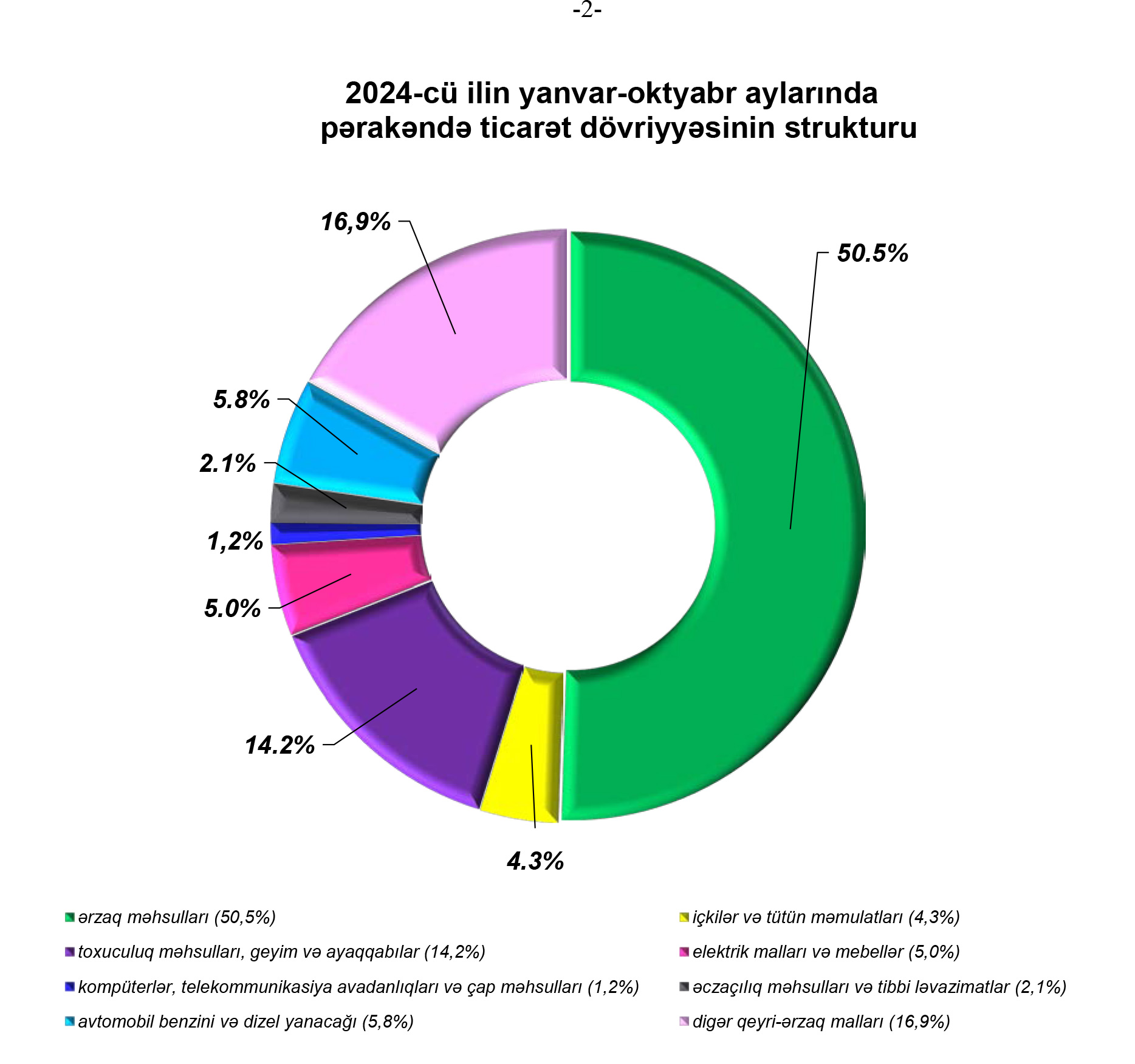 2024-cü ilin yanvar-oktyabr aylarında alıcıların pərakəndə ticarət şəbəkəsində aldıqları mallara xərclədiyi vəsaitin 50,5 faizi ərzaq məhsullarının, 4,3 faizi içkilər və tütün məmulatlarının, 14,2 faizi toxuculuq məhsulları, geyim və ayaqqabıların, 5,8 faizi avtomobil benzini və dizel yanacağının, 5,0 faizi elektrik malları və mebellərin, 2,1 faizi əczaçılıq məhsulları və tibbi ləvazimatların, 1,2 faizi kompüterlər, telekommunikasiya avadanlıqları və çap məhsullarının, 16,9 faizi isə digər qeyri-ərzaq mallarının alınmasına sərf olunmuşdur.