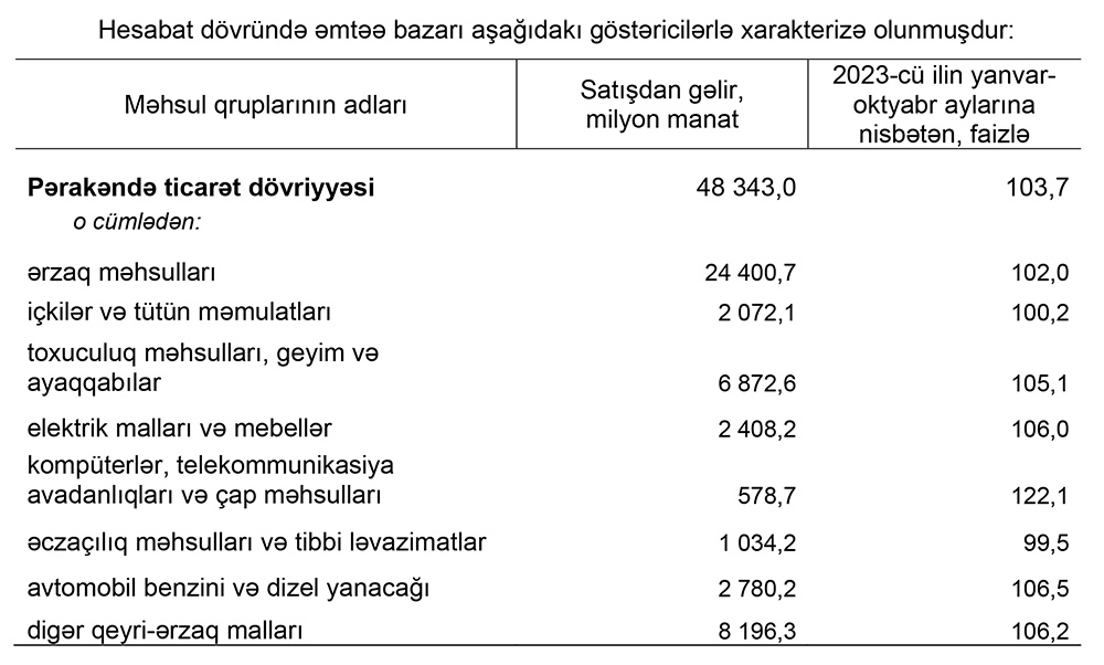 Dövlət Statistika Komitəsinin yaydığı məlumata görə, 2023-cü ilin yanvaroktyabr ayları ilə müqayisədə pərakəndə ticarət dövriyyəsi real ifadədə 3,7 faiz, o cümlədən ərzaq məhsulları, içkilər və tütün məmulatları üzrə 1,9 faiz, qeyri-ərzaq malları üzrə 5,9 faiz artmışdır.