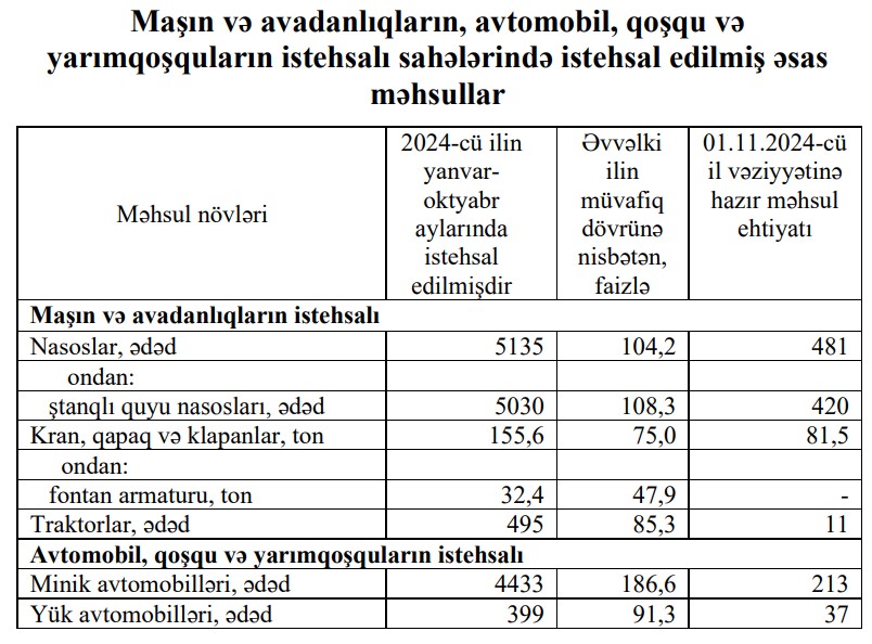 2024-сü ilin yanvar-oktyabr aylarında Azərbaycanda 399 ədəd yük avtomobilləri yığılıb. Bu, əvvəlki ilin müvafiq dövrü ilə müqayisədə 8,7% azdır. 01.11.2024-cü il vəziyyətinə hazır məhsul ehtiyatı 37 ədəd olub.