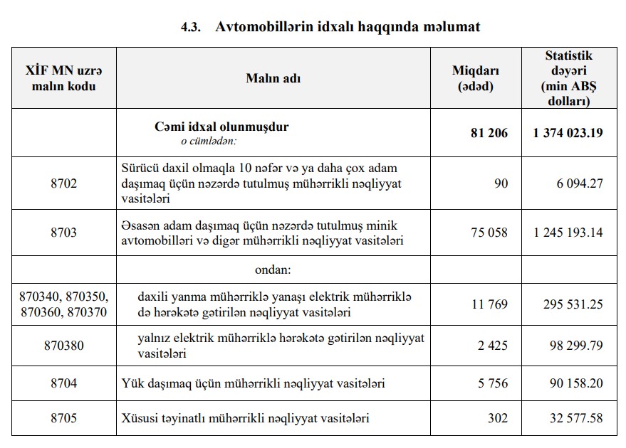 2024-cü ilin 10 ayı ərzində (yanvar-oktyabr) Azərbaycana 1 milyard 484 milyon 417 min dollar dəyərində 74 min 723 ədəd avtomobil idxal olunub. 2023-cü ilin eyni dövründə Azərbaycana 1 milyard 374 milyon 23 min dollar dəyərində 81 min 206 ədəd avtomobil idxal olunmuşdu.