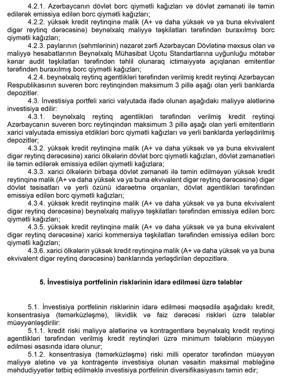 Qəraraə əsasən, poçt rabitəsinin milli operatorunun investisiya portfelini idarə etməsinin məqsədi maliyyə xidmətləri sahəsində nəzarətedici qurumun müəyyən etdiyi prudensial və likvidlik tələbləri təmin edilmək şərtilə investisiya gəlirinin əldə edilməsidir.