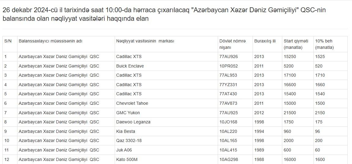 İqtisadiyyat Nazirliyi yanında Əmlak Məsələləri Dövlət Xidməti (ƏMDX) “Azərbaycan Xəzər Dəniz Gəmiçiliyi” QSC-nin (ASCO) balansında olan 12 avtonəqliyyat vasitəsini açıq hərraca çıxarır.