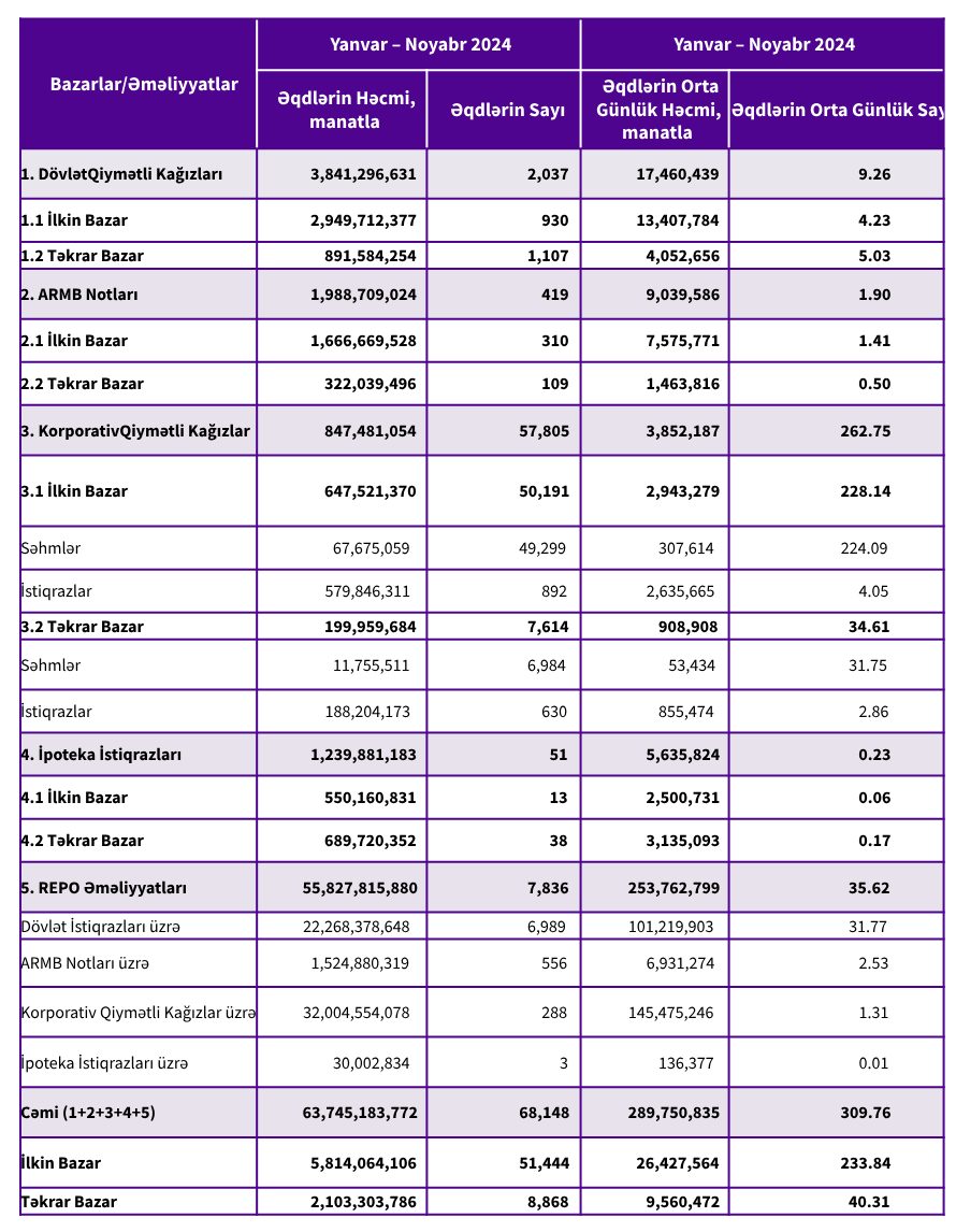 2024-cü ilin 11 ayı ərzində BFB-də cəmi əməliyyatların 87,6%-i və ya 55 milyard 827 milyon 815 min manatı repo əməliyyatları üzrə olub.