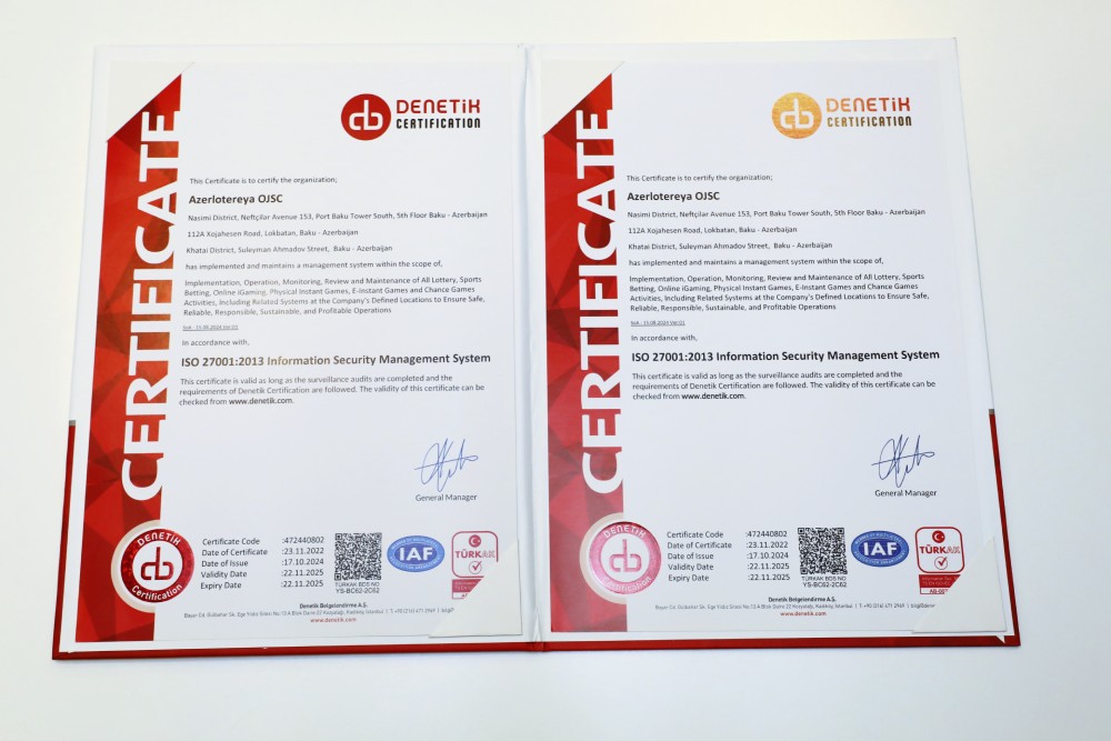 (®) Ölkənin qanuni lotereya təşkilatçısı və idman mərc oyunları operatoru “Azərlotereya” ASC şəffaf fəaliyyəti ilə təkcə milli qanunvericiliyin deyil, həm də sahəvi standartların tələblərinə uyğun fəaliyyət göstərmək öhdəliyini daşıyır. 2024-cü ilin oktyabr ayında keçirilmiş sertifikasiya auditi nəticəsində şirkətin üç beynəlxalq standart üzrə sertifikat uyğunluğu təsdiq edilib.