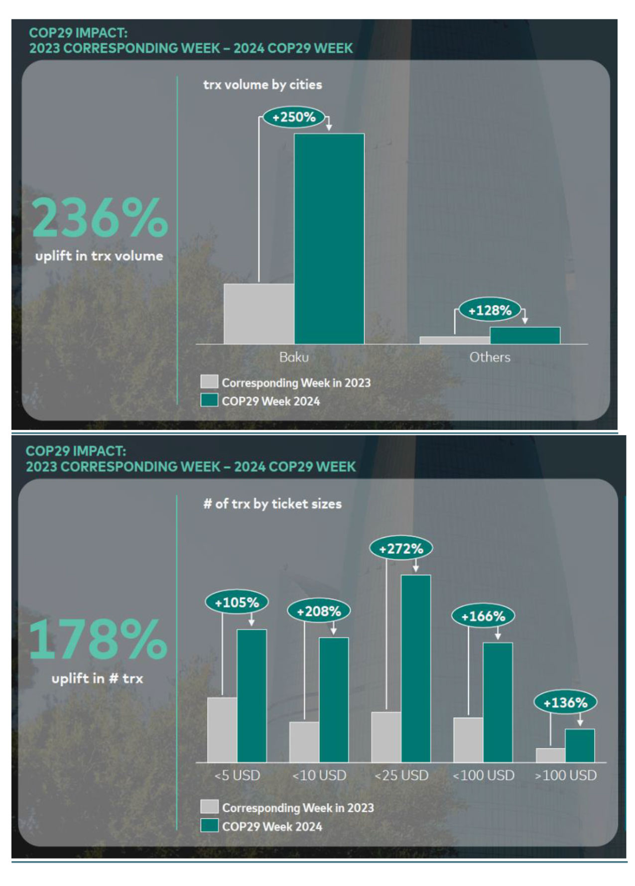Qonaqlama və iaşə sektoru əsas COP29 dövründə yüksəliş əldə edən sahələr kimi fərqlənib. Mehmanxana və qidalanma üzrə xərcləmələr 400%-dən çox artaraq əsas sənayelərə iqtisadi səmərələr gətirib. Böyük məbləğli əməliyyatlarda da artım qeydə alınıb: 10 və 25 dollar dəyərindəki ödənişlər 200%-dən çox yüksəlib.