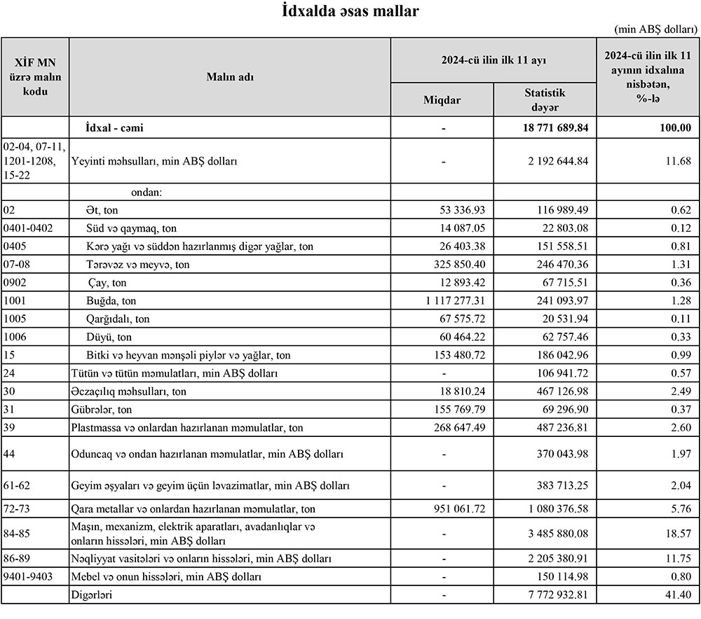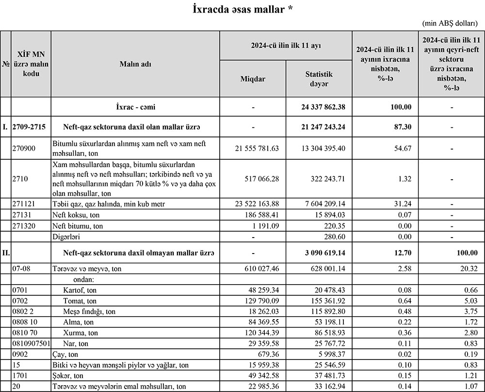 2024-cü ilin yanvar-noyabr aylarında (11 ayda) Azərbaycanın ən çox ixrac və idxal etdiyi mallar.