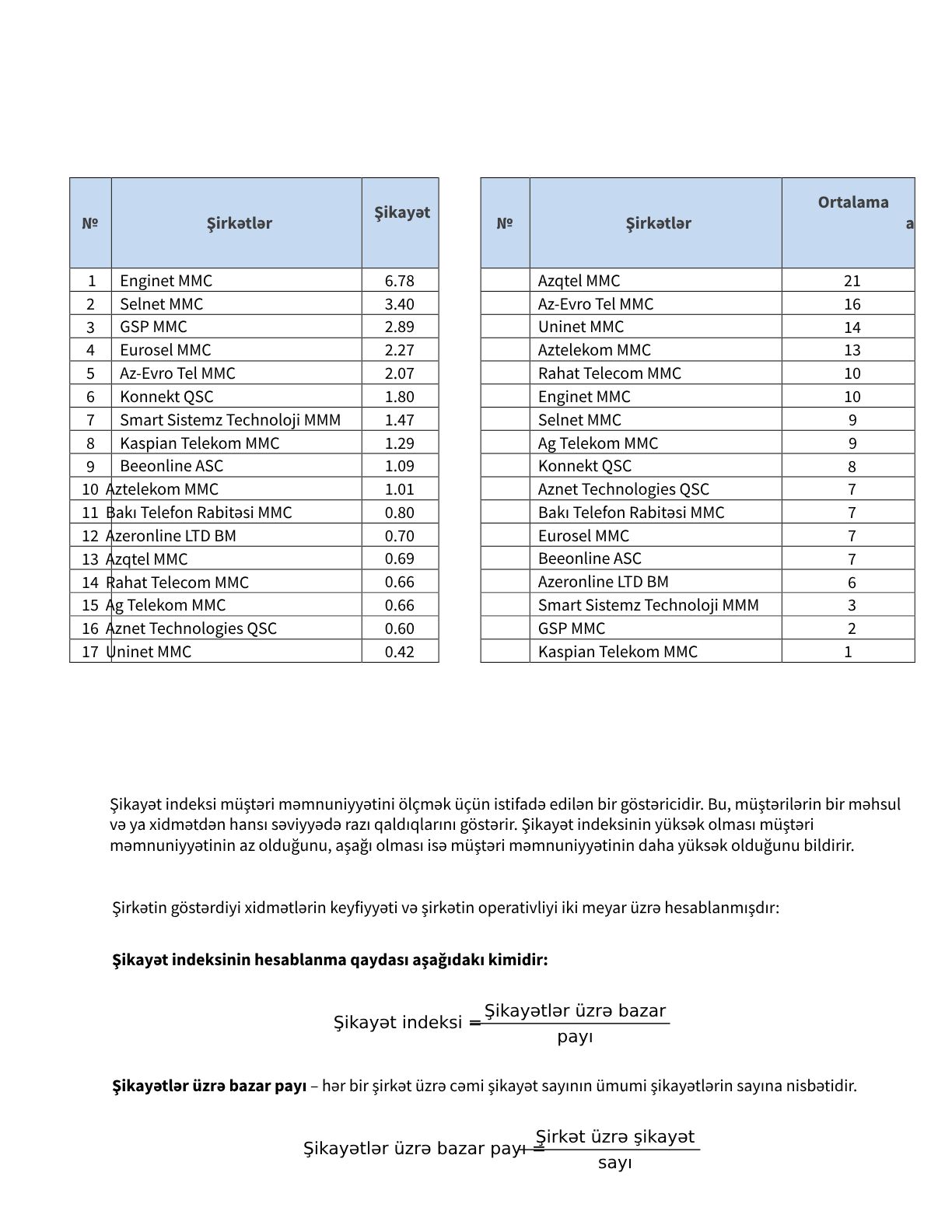 Şikayət indeksinin yüksək olması müştəri məmnuniyyətinin az olduğunu, aşağı olması isə müştəri məmnuniyyətinin daha yüksək olduğunu bildirir. Enginet MMC, Selnet MMC, GSP MMC, Eurosel MMC, Az-Evro Tel MMC müştəri məmnuniyyətinin ən az olduğu, Uninet MMC, Aznet Technologies QSC, Ag Telekom MMC, Rahat Telecom MMC, Azqtel MMC, Azeronline LTD BM, Bakı Telefon Rabitəsi MMC müştəri məmnuniyyətinin daha yüksək olduğu şirkətlərdir. Daha ətraflı aşağıdakı siyahıdan tanış ola bilərsiniz.