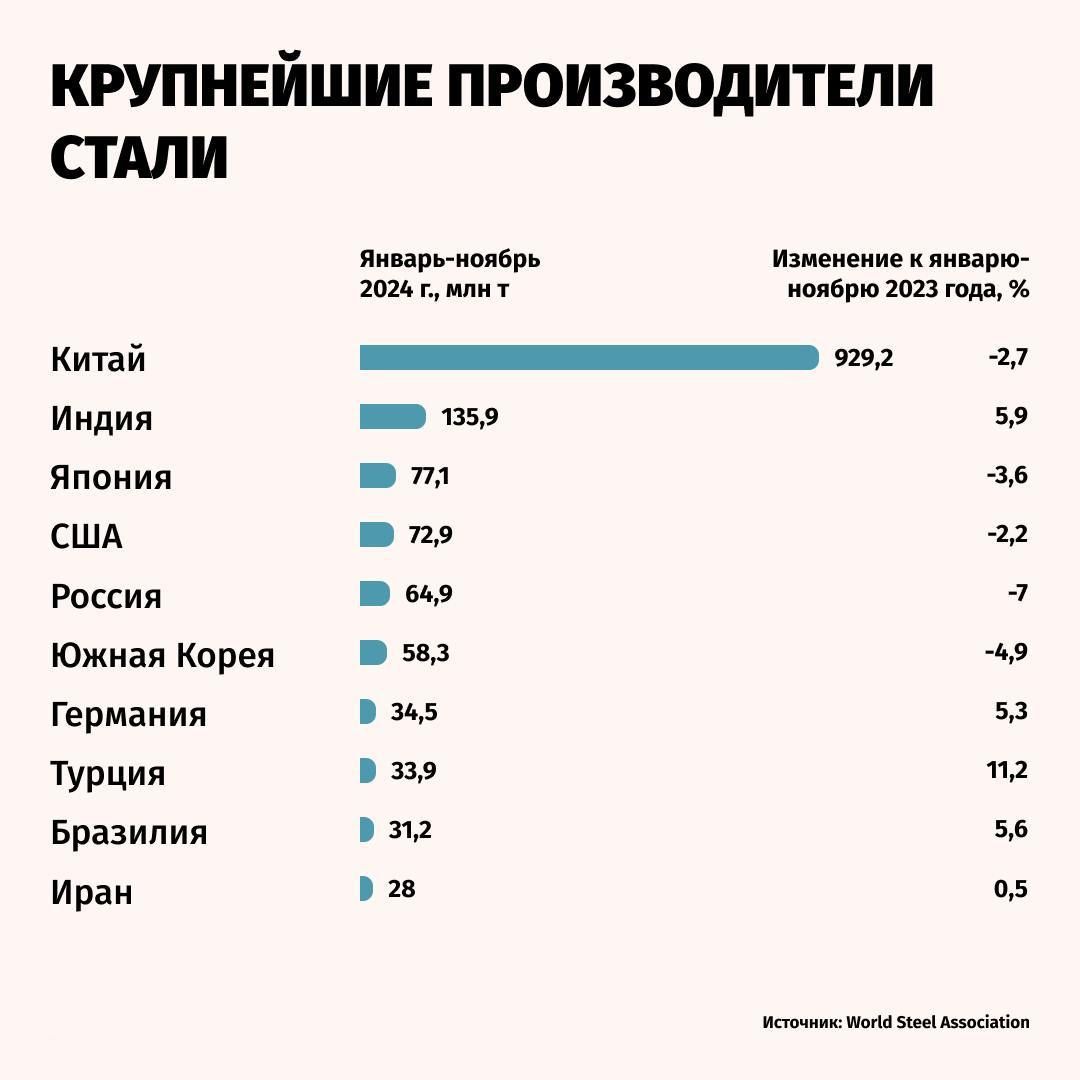 Statistikalar ən böyük istehsalçıları da göstərir. Rusiya istisna olmaqla, Çin 78,4 milyon ton (+2,5%), Hindistan 12,4 milyon ton (+4,5%) Yaponiya 6,9 milyon ton (-3,1%), ABŞ 6,4 milyon ton (-2,8%) , Cənubi Koreya 5,2 milyon ton (-3,6%), Almaniya 2,9 milyon ton (+8,6%), Türkiyə 3 milyon ton (+0,7%), Braziliya 2,8 milyon ton (+1,9%), İran 3,1 milyon ton (+0,1%) polad istehsal edib.