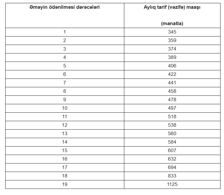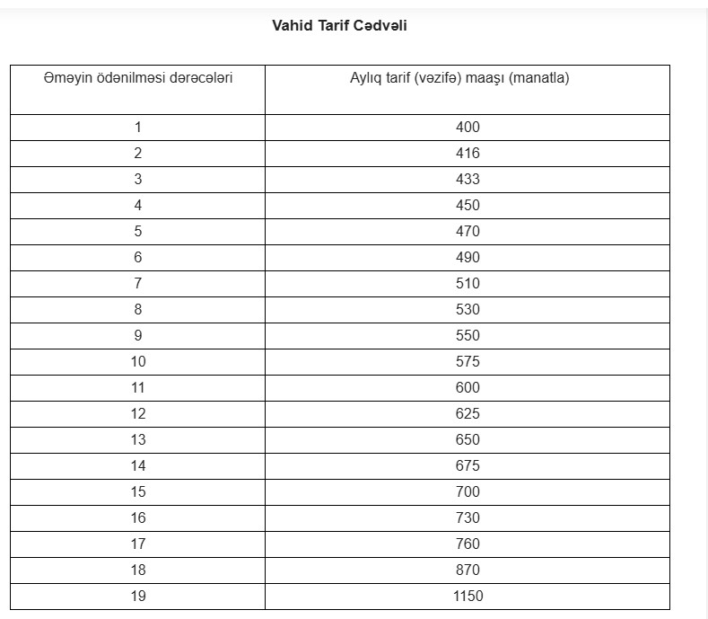 Qeyd edək ki, indiyə qədər Dövlət büdcəsindən maliyyələşdirilən sahələrdə çalışan işçilərin əməyinin ödənilməsinin Vahid Tarif Cədvəli aşağıdakı kimi olub: