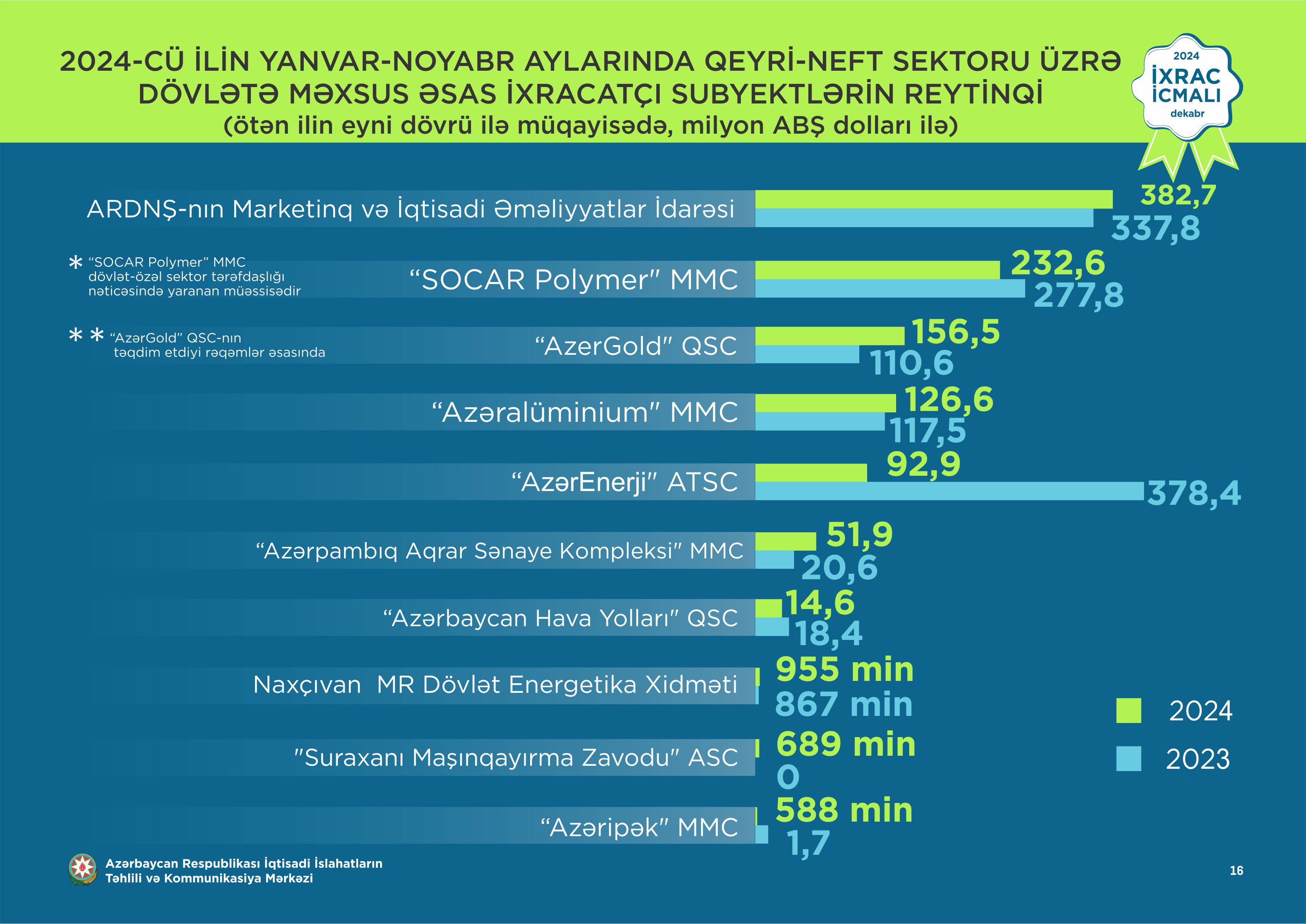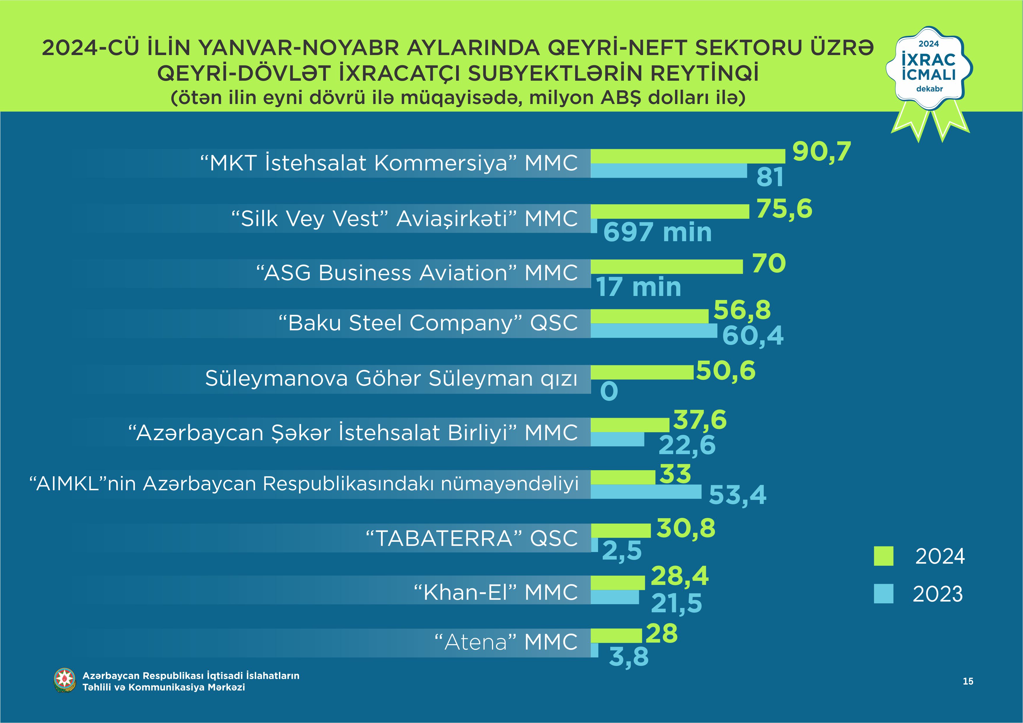 Marja xəbər verir ki, İcmalda Yanvar-noyabr ayları üzrə hazırlanmış qeyri-dövlət ixracatçı subyektlərin reytinqində ilk onluqda aşağıdakı şirkətlər təmsil olunublar: “MKT İstehsalat Kommersiya” MMC, “Silk Vey Vest Aviaşirkəti” MMC, “ASG Business Aviation” MMC, “Baku Steel Company” QSC, Süleymanova Göhər Süleyman qızı, “Azərbaycan Şəkər İstehsalat Birliyi” MMC, “Azərbaycan İnterneyşnl Mayninq Kompani Limited Şirkəti”nin Azərbaycan Respublikasındakı nümayəndəliyi, "Tabaterra" QSC, “Khan-El” MMC, “Atena” Məhdud Məsuliyyətli Cəmiyyəti.