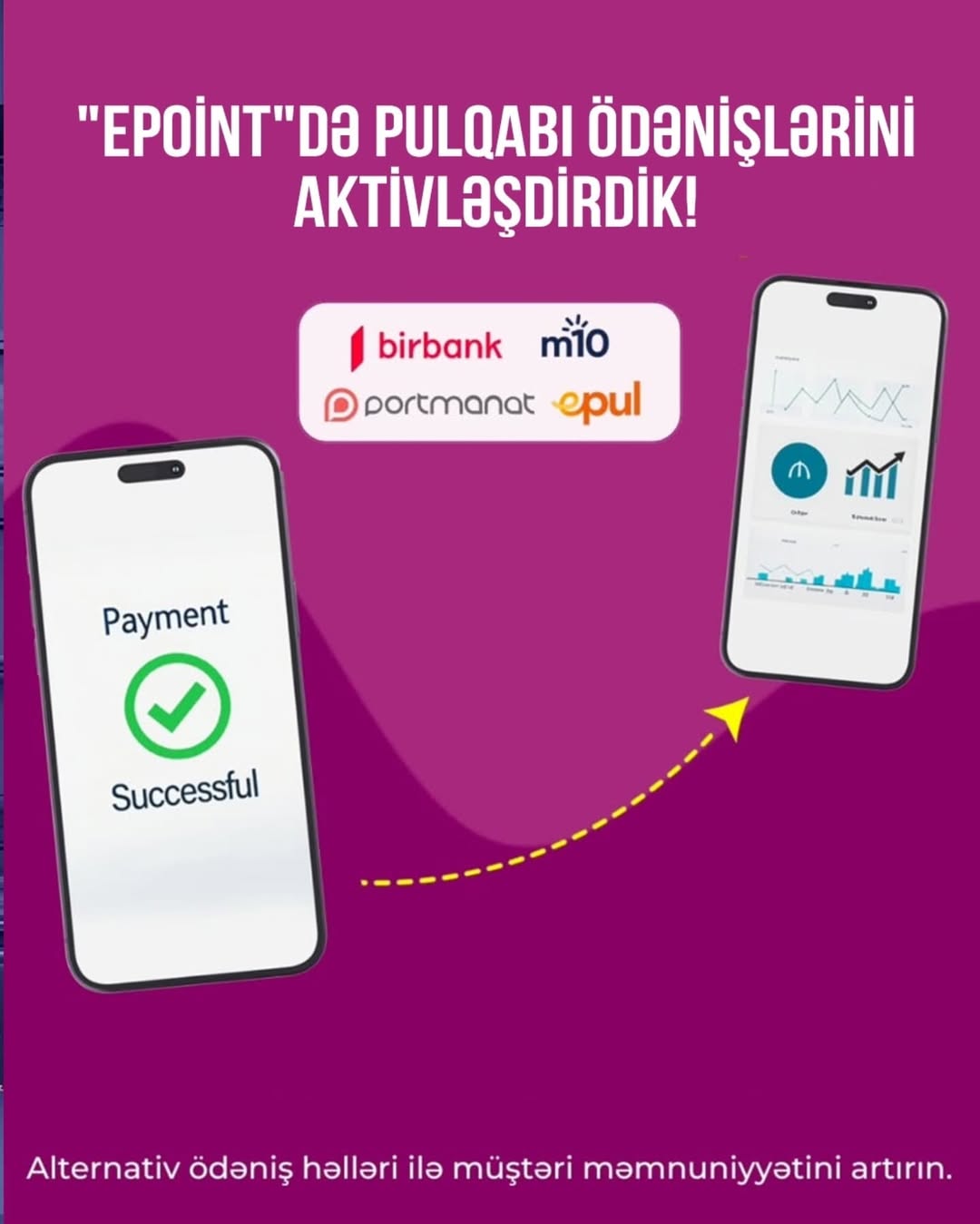 “Epoint” sahibkarları və şirkətləri tez, rahat və təhlükəsiz elektron ödənişlər üçün “Epoint”-ə qoşulumağa dəvət edir. "Epoint" M10, Portmanat, Epul və Birbank kimi populyar elektron pulqabılar vasitəsilə ödənişləri qəbul etməyi mümkün edir. Bu müasir və rahat ödəniş üsulu bizneslərə daha çox seçim imkanı yaradaraq, müştərilər üçün təhlükəsiz və əlçatan ödəmə təcrübəsi təmin edir. Elektron pulqabılar kiçik və orta biznes üçün ideal bir həll yoludur.