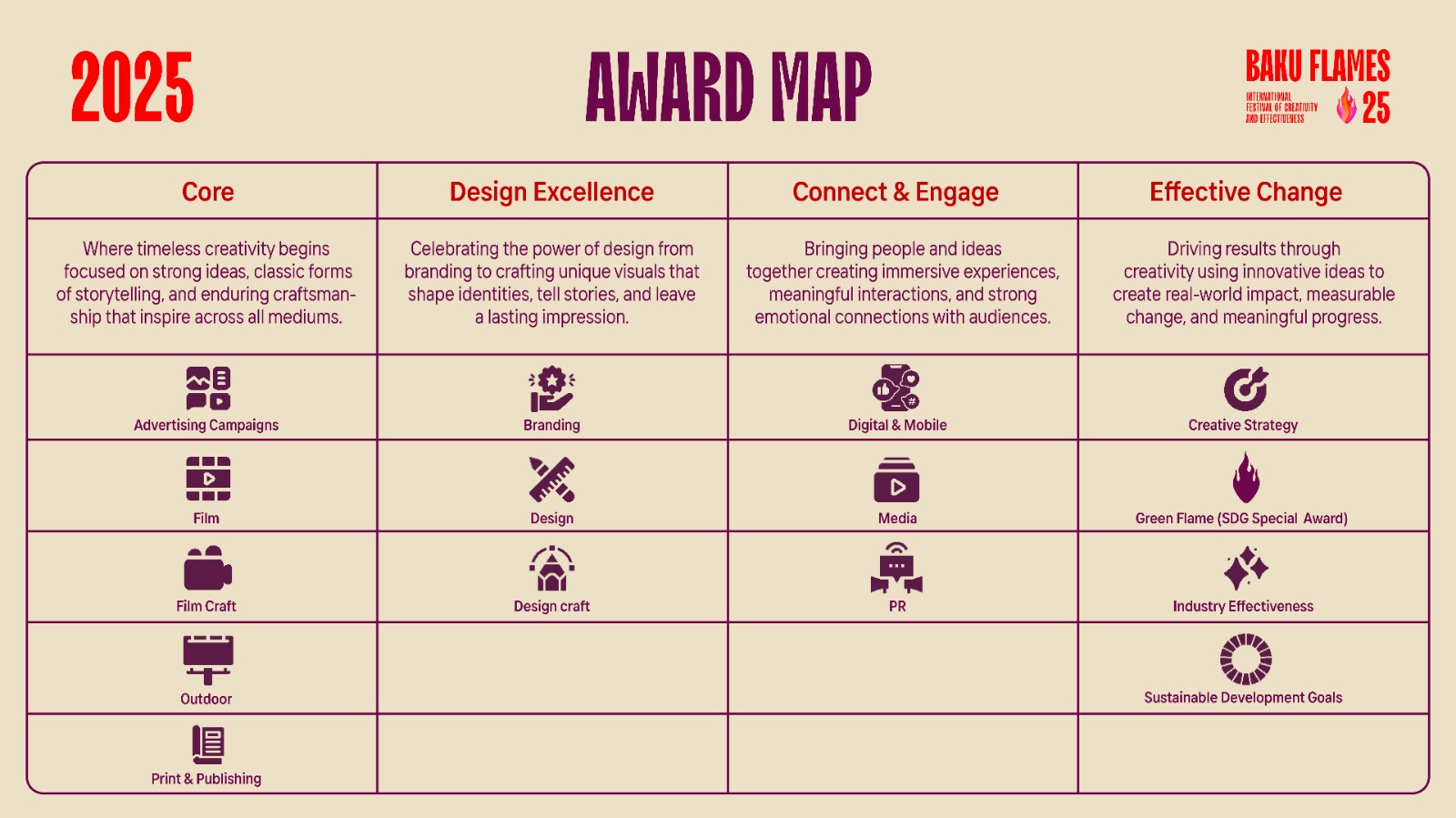 - Festivalın ən önəmli hadisəsi — “Baku Flames Mükafatlandırma Mərasimi”ndə yaradıcı və effektiv işlərin mükafatlandırılması.