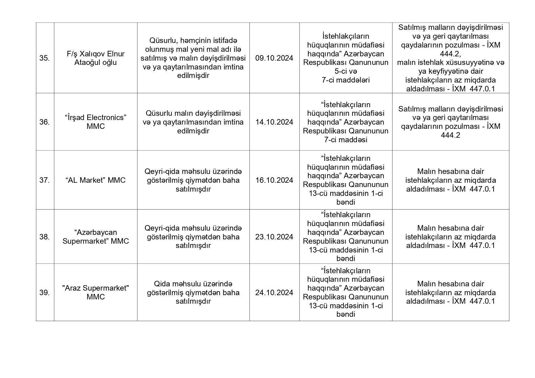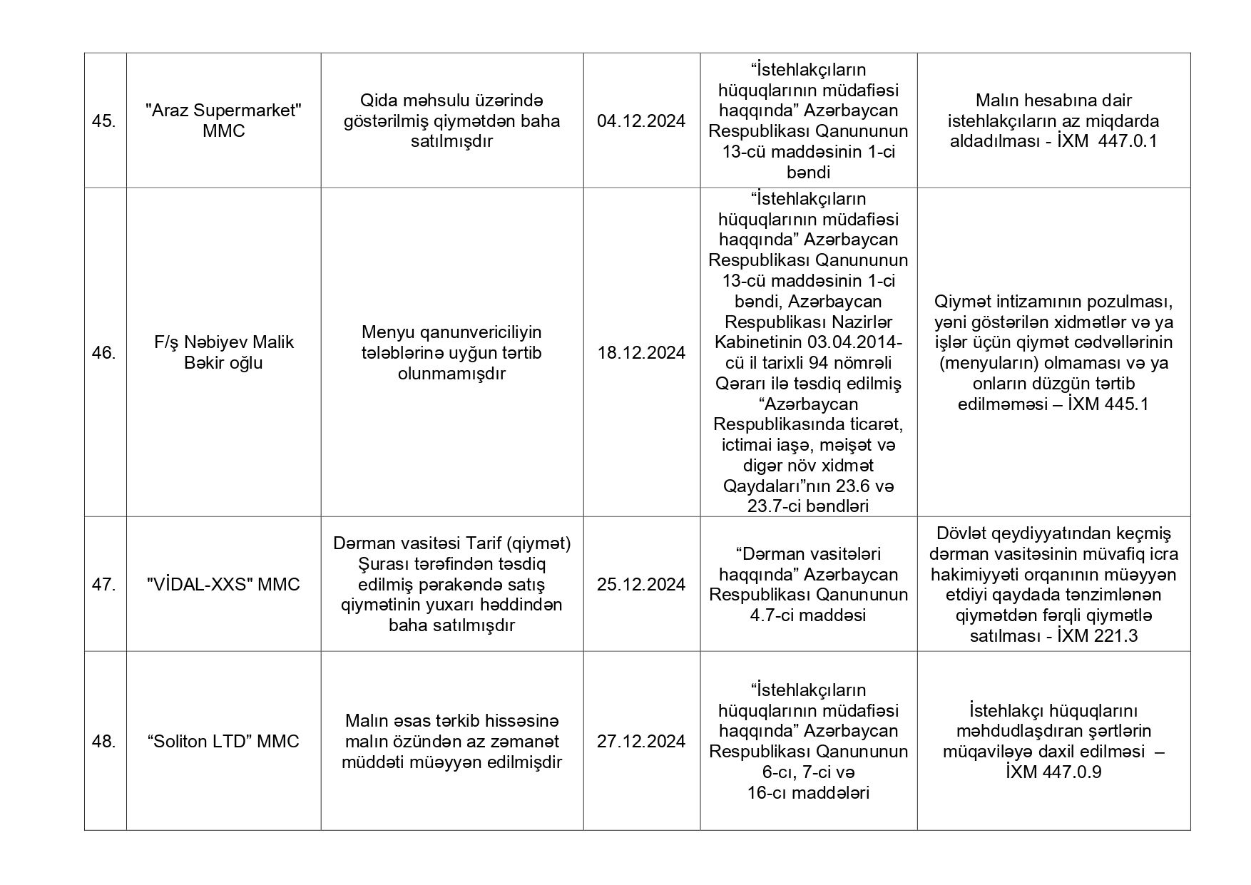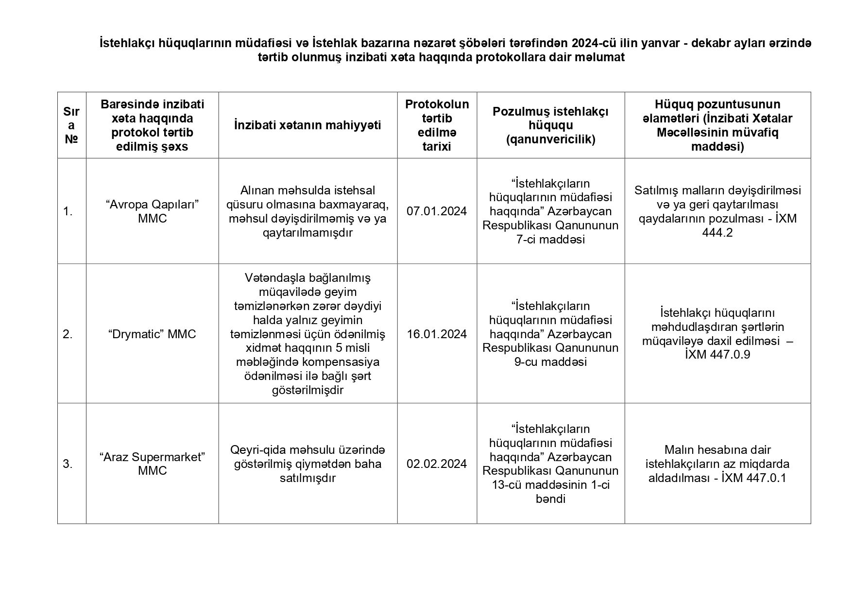 İqtisadiyyat Nazirliyi yanında Antiinhisar və İstehlak Bazarına Nəzarət Dövlət Xidməti İstehlakçı hüquqlarının müdafiəsi və İstehlak bazarına nəzarət şöbələri tərəfindən 2024-cü ilin yanvar - dekabr ayları ərzində tərtib olunmuş inzibati xəta haqqında protokollara dair məlumat yayıb.