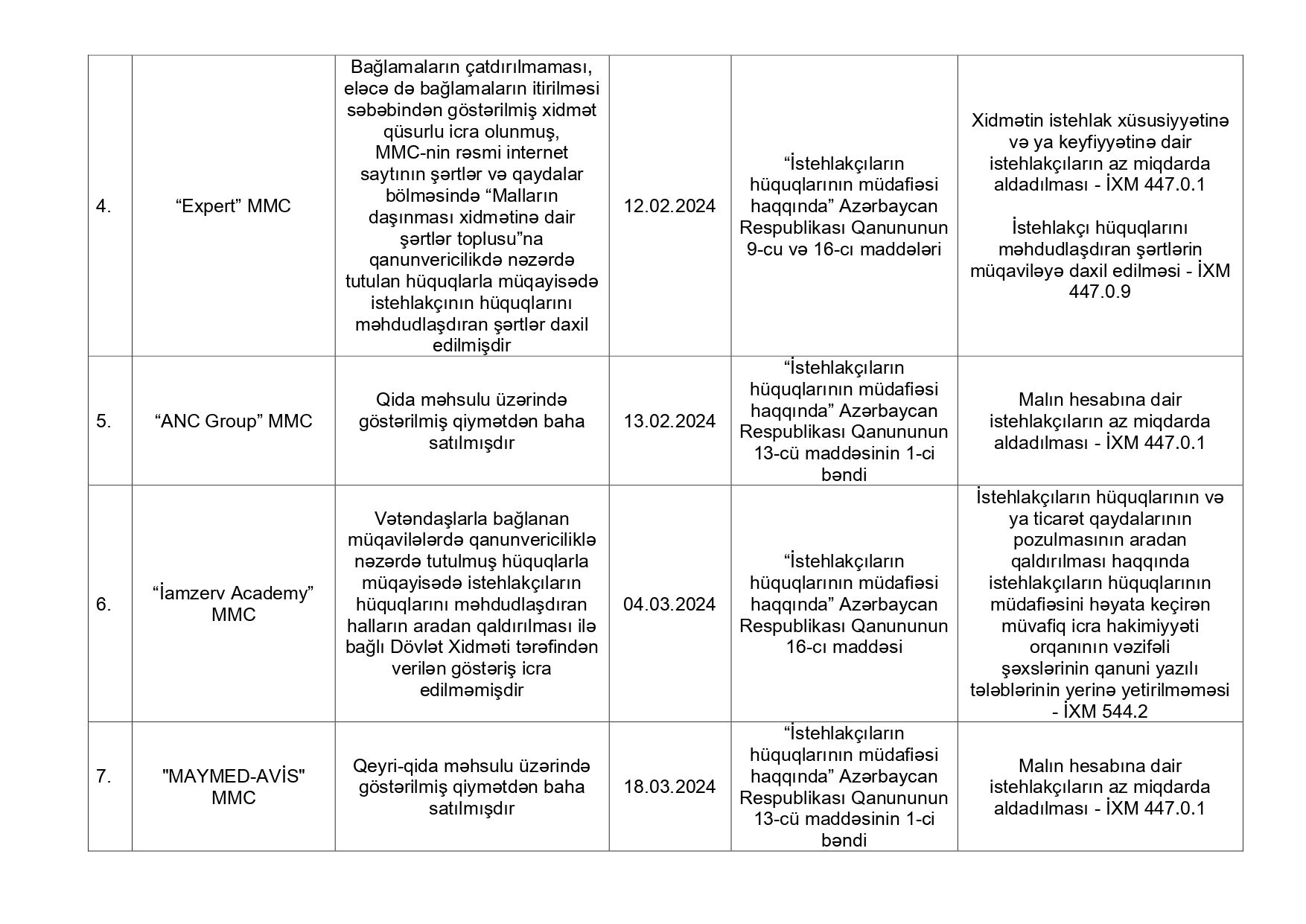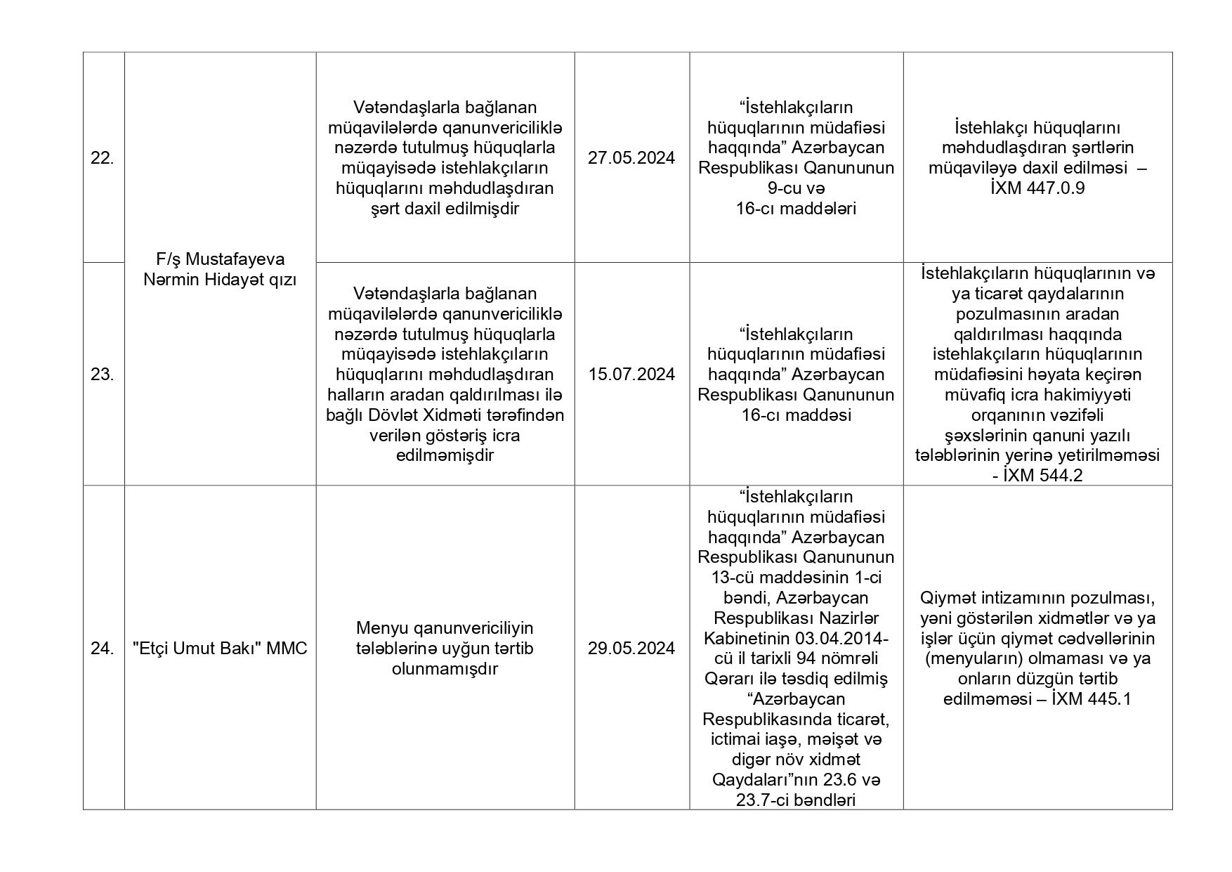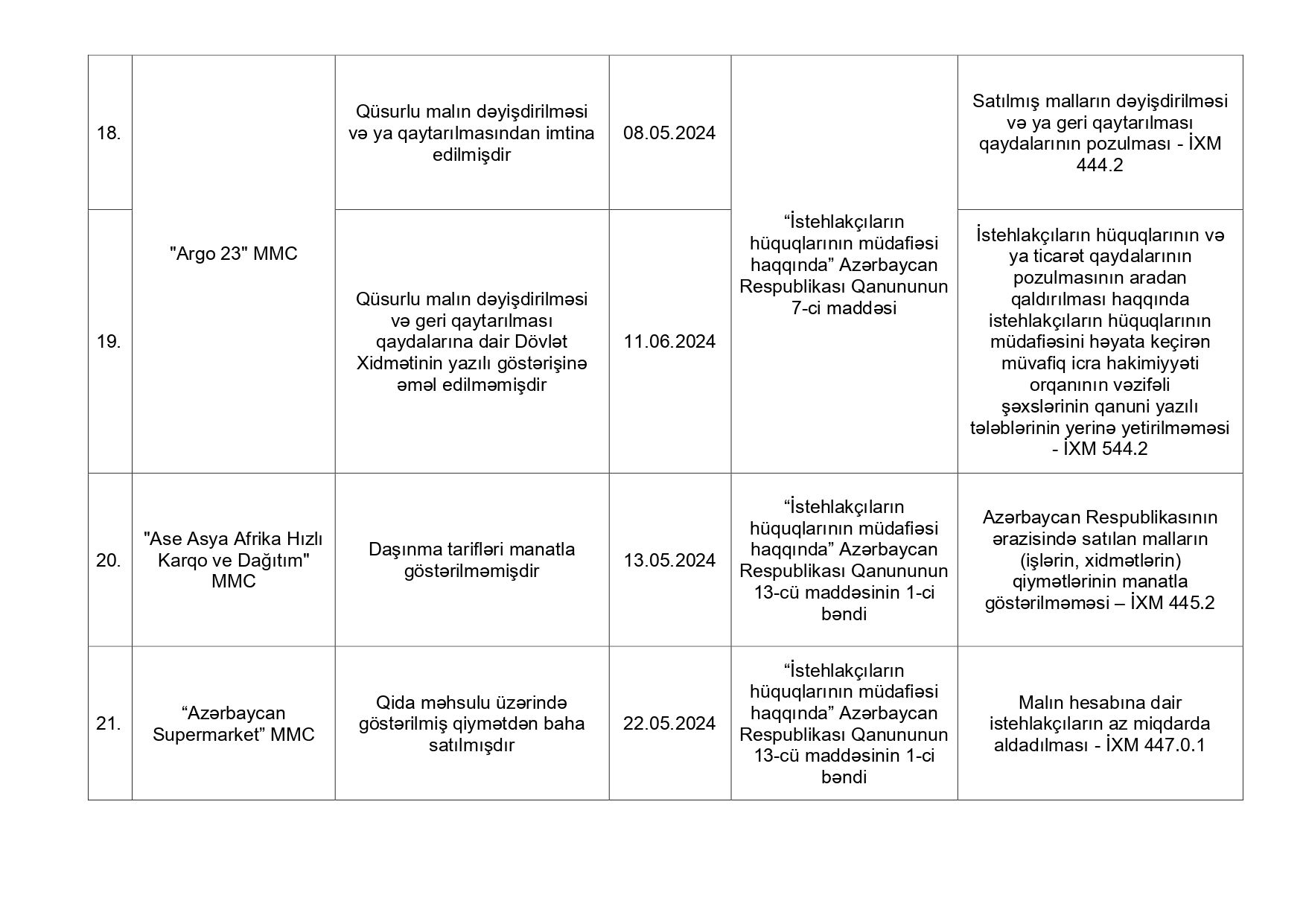 İqtisadiyyat Nazirliyi yanında Antiinhisar və İstehlak Bazarına Nəzarət Dövlət Xidməti İstehlakçı hüquqlarının müdafiəsi və İstehlak bazarına nəzarət şöbələri tərəfindən 2024-cü ilin yanvar - dekabr ayları ərzində tərtib olunmuş inzibati xəta haqqında protokollara dair məlumat yayıb.