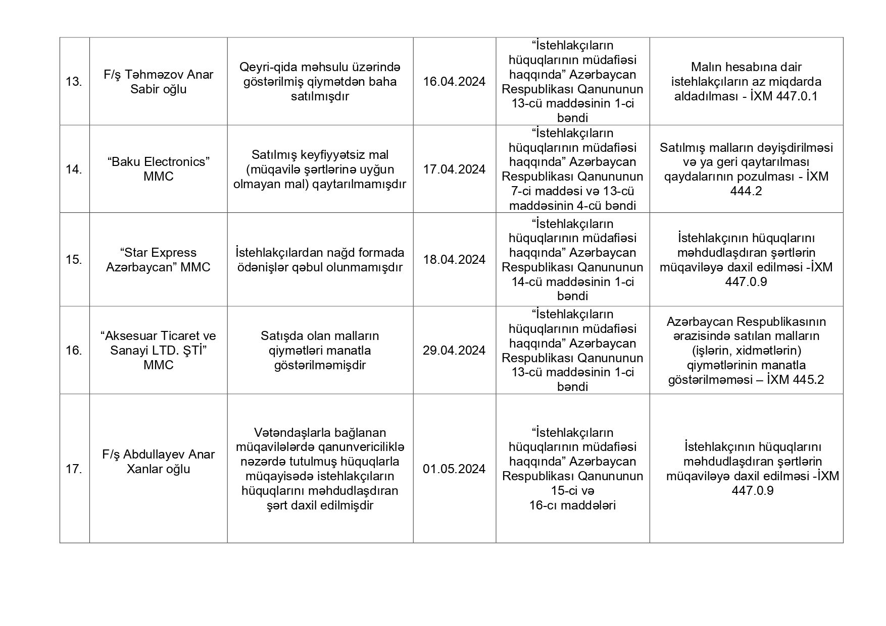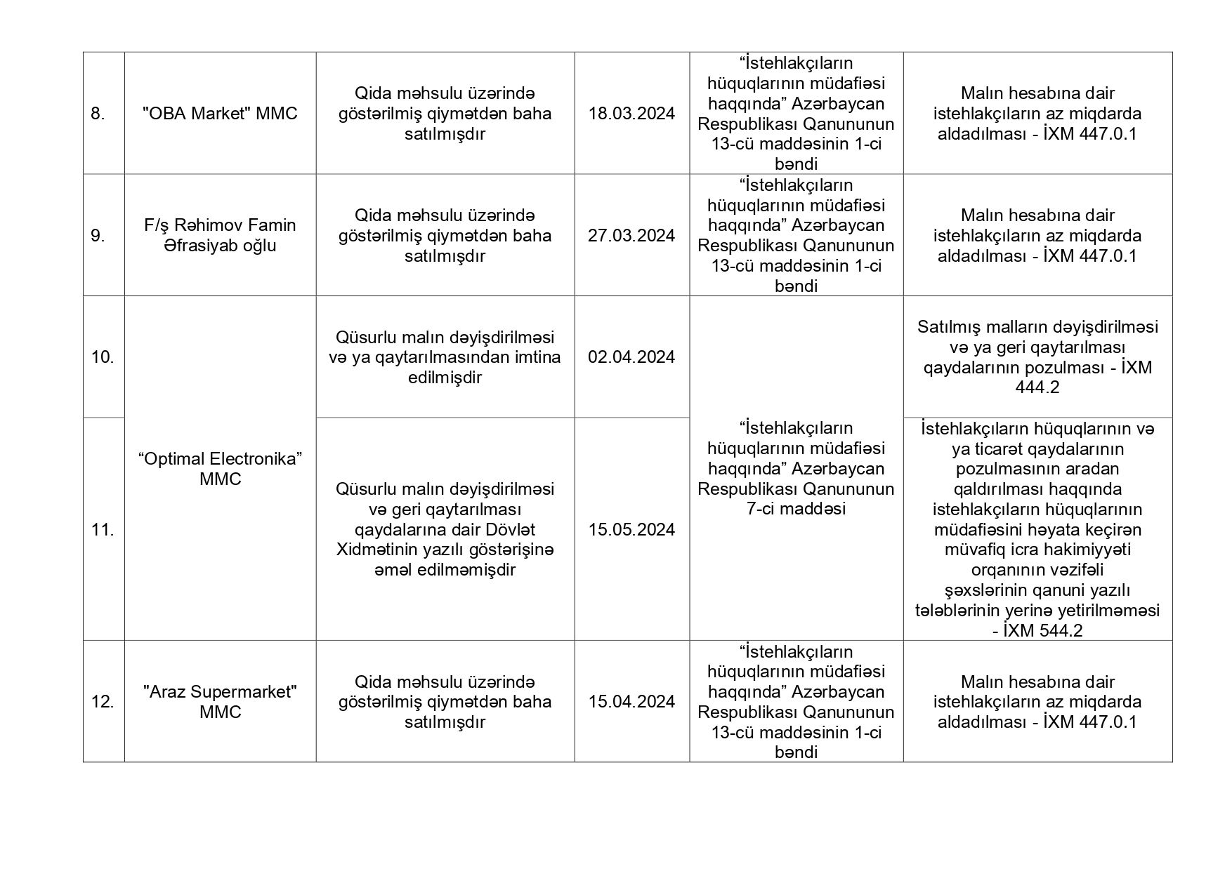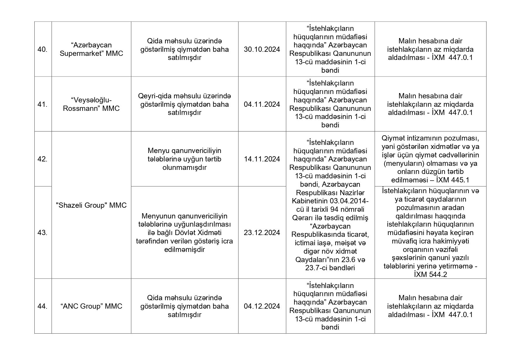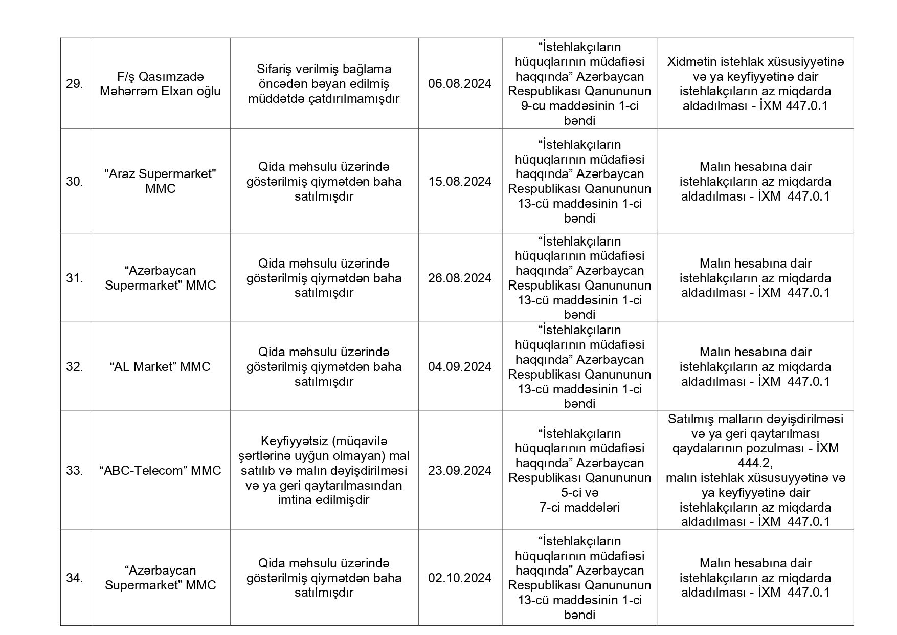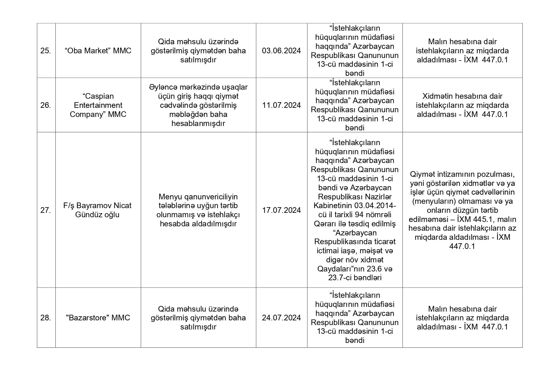 Məhsulları üzərindən göstərilmiş qiymətdən baha satmış və alıcıların hüquqlarını pozmuş şirkətlərin adları açıqlandı - ONLAR CƏRİMƏLƏNİB