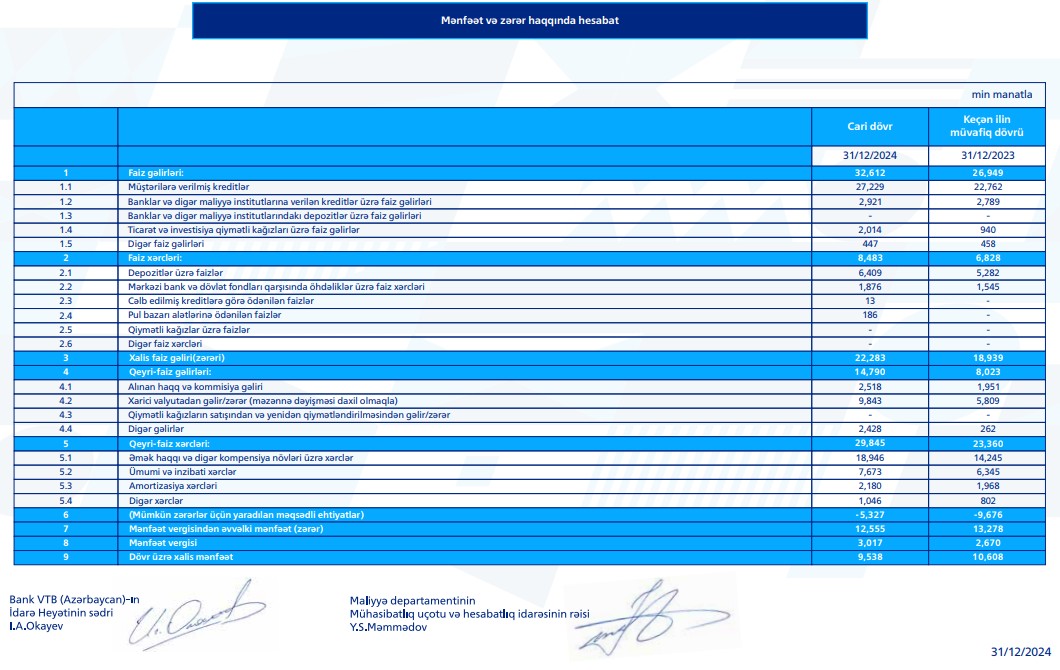Rusiya kapitallı "Bank VTB (Azərbaycan)" ASC 2024-cü il üzrə maliyyə göstəricilərini açıqlayıb.