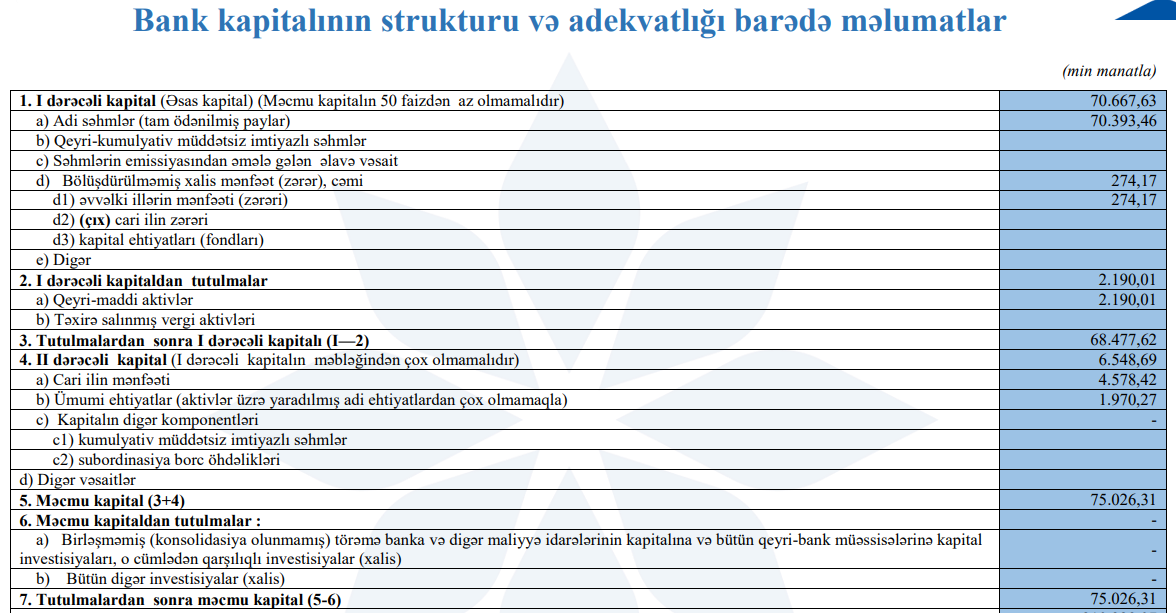 31 dekabr 2024-cü il tarixində "AFB Bank" 75 milyon 26 min manat məcmu kapitala malik olub ki, bu da Mərkəzi Bankın minimal tələbindən (50 milyon manat) xeyli yüksəkdir.