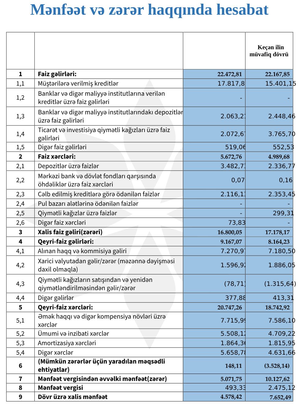 Müqayisə üçün qeyd edək ki, 2023-cü ildə "AFB Bank"ın cəmi əməliyyat gəlirləri 30 milyon 332 min manat, cəmi əməliyyat xərcləri 23 milyon 732 min manat, gəlirlər xərcləri üstələdiyindən əməliyyat mənfəəti 6 milyon 600 min manat təşkil etmişdi. Həmçinin mümkün zərərlər üçün yaradılan məqsədli ehtiyatlardan azad olmuş 3 milyon 528 min manat mənfəətə əlavə olunmuşdu. Bank 10 milyon 128 min manat mənfəət vergisindən əvvəlki mənfəətindən 2 milyon 475 min manat mənfəət vergisi ödəmişdi.