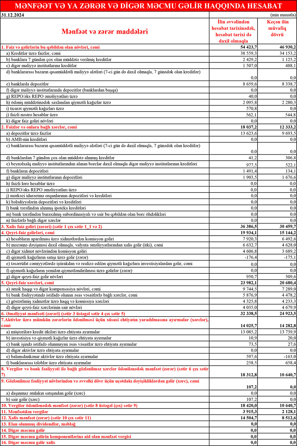 “Ziraat Bank Azərbaycan” ötən ilin əməliyyat mənfəəətindən 14 milyon 26 min manat aktivlər üzrə mümkün zərərlərin ödənilməsi üçün xüsusi ehtiyatın yaradılmasına ayırıb (2023-cü ildə 14 milyon 283 min manat ayırmışdı).