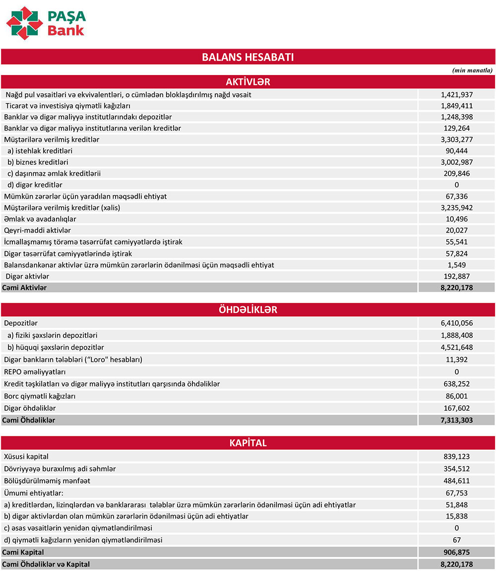 Müqayisə üçün qeyd edək ki, 2023-cü ildə “PAŞA Bank”ın cəmi əməliyyat gəlirləri (faiz və qeyri-faiz gəlirləri) 669 milyon 696 min manat, cəmi əməliyyat xərcləri (faiz və qeyri-faiz xərcləri) 377 milyon 318 min manat, gəlirlər xərcləri üstələdiyindən əməliyyat mənfəəti 292 milyon 378 min manat təşkil etmişdi. Bank əməliyyat mənfəətindən 36 milyon 162 min manat mümkün zərərlər üçün yaradılan məqsədli ehtiyatlara ayırmış və 57 milyon 8 min manat mənfəət vergisi ödəmişdi.