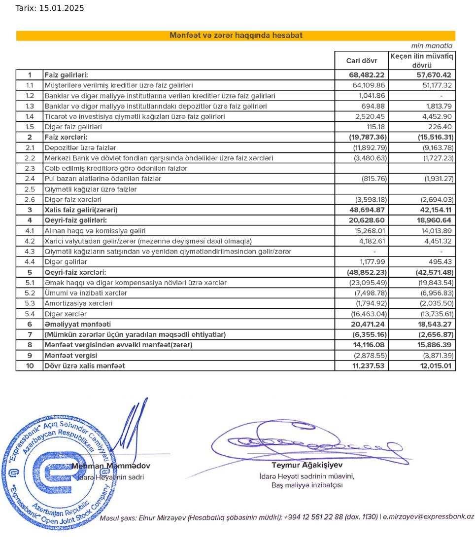 Expressbank 2024-cü ilin 4-cü rübü üzrə nəticələrini açıqlayıb.