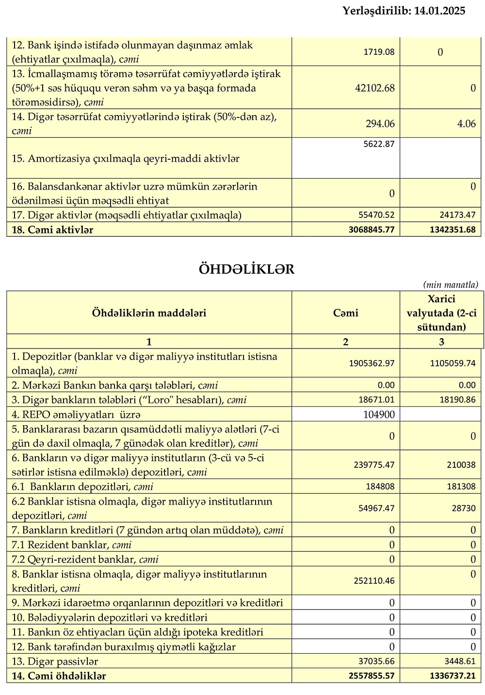 Keçən il "Xalq Bank"ın depozit portfeli 315 milyon 609 min manat kiçilərək 31 dekabr 2024-cü il tarixində 1 milyard 905 milyon 362 min manat təşkil edib.