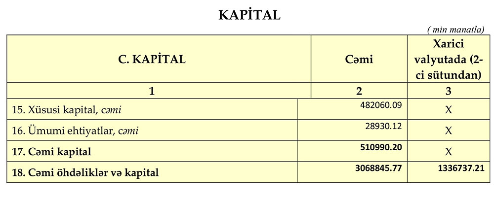 31 dekabr 2024-cü il tarixində "Xalq Bank" 462 milyon 971 min manat məcmu kapitala malik olub. Bank 2023-cü ilin sonunda 455 milyon 767 min manat məcmu kapitala malik idi.