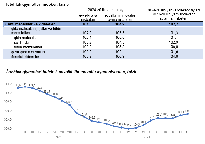 2024-cü ilin dekabr ayında istehlak qiymətləri indeksi əvvəlki aya nisbətən 1 faiz, yanvar-dekabr aylarında isə əvvəlki ilin müvafiq dövrünə nisbətən 2,2 faiz yüksəlib.