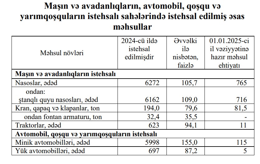 2024-сü ildə Azərbaycanda 5 min 998 ədəd və ya əvvəlki illə müqayisədə 2129 ədəd (və ya 55%) çox minik avtomobili istehsal olunub.