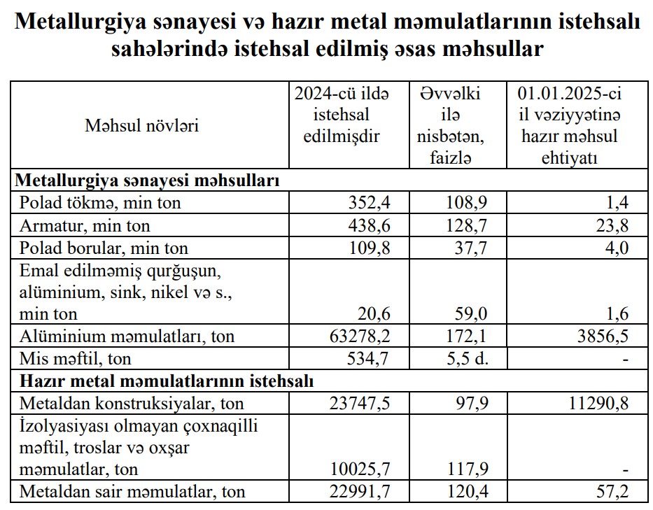 Qeyd edilib ki, 2024-сü ildə metallurgiya sənayesi üzrə mis məftilin istehsalı 5,5 dəfə, alüminium məmulatlarının istehsalı 72,1 faiz, armatur istehsalı 28,7 faiz, hazır metal məmulatlarının istehsalı sahəsi üzrə metaldan sair məmulatların istehsalı 20,4 faiz, izolyasiyası olmayan çoxnaqilli məftil, troslar və oxşar məmulatların istehsalı isə 17,9 faiz artmışdır.