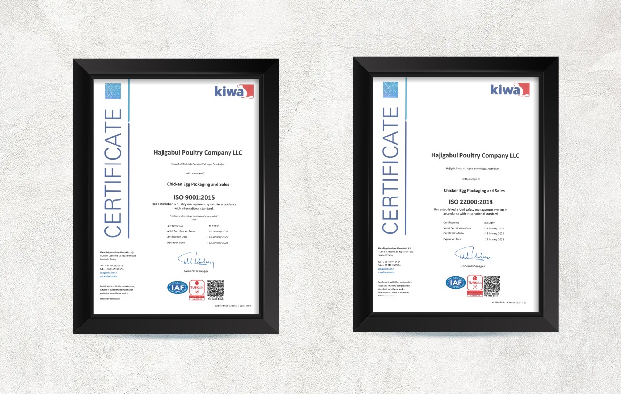 Qafqazın ən böyük yumurta istehsalçılarından olan Hacıqabul Quşçuluq Şirkəti İSO 9001:2015 Keyfiyyəti İdarəetmə və İSO 22000:2018 (HACCP) Qida Təhlükəsizliyi İdarəetmə sertifikatlarına layiq görülüb.“Keyfiyyət təminatımızdır” missiyasını həyata keçirən Hacıqabul Quşçuluq Şirkəti bu öhdəliyi Beynəlxalq İSO sertifikatları ilə təsdiq edib.
