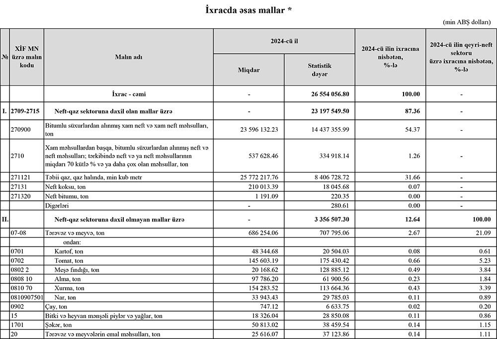 2024-cü ildə Azərbaycanın neft-qaz sektoruna daxil olmayan mallar üzrә ixracının cəmi dəyəri 3 milyard 356 milyon 507 min dollar olub. Bu dəyər 2023-cü ildə 3 milyard 348 milyon 47 min dollar təşkil etmişdi. Beləliklə, ötən il Azərbaycanın qeyri-neft-qaz ixracı 8 milyon 461 min dollar və ya 0,25% artıb.