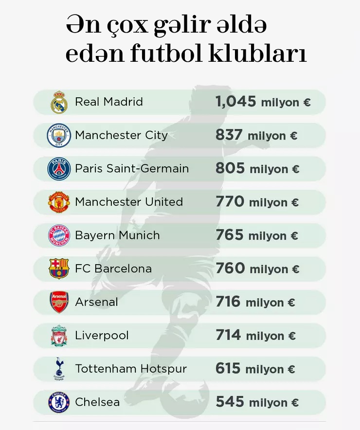 Ən çox gəlir əldə edən futbol klubları açıqlanıb - SİYAHI