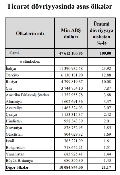 O cümlədən, Azərbaycanın ticarət dövriyyəsində əsas ölkələr, ixracda və idxalda əsas ölkələr məlum olub.