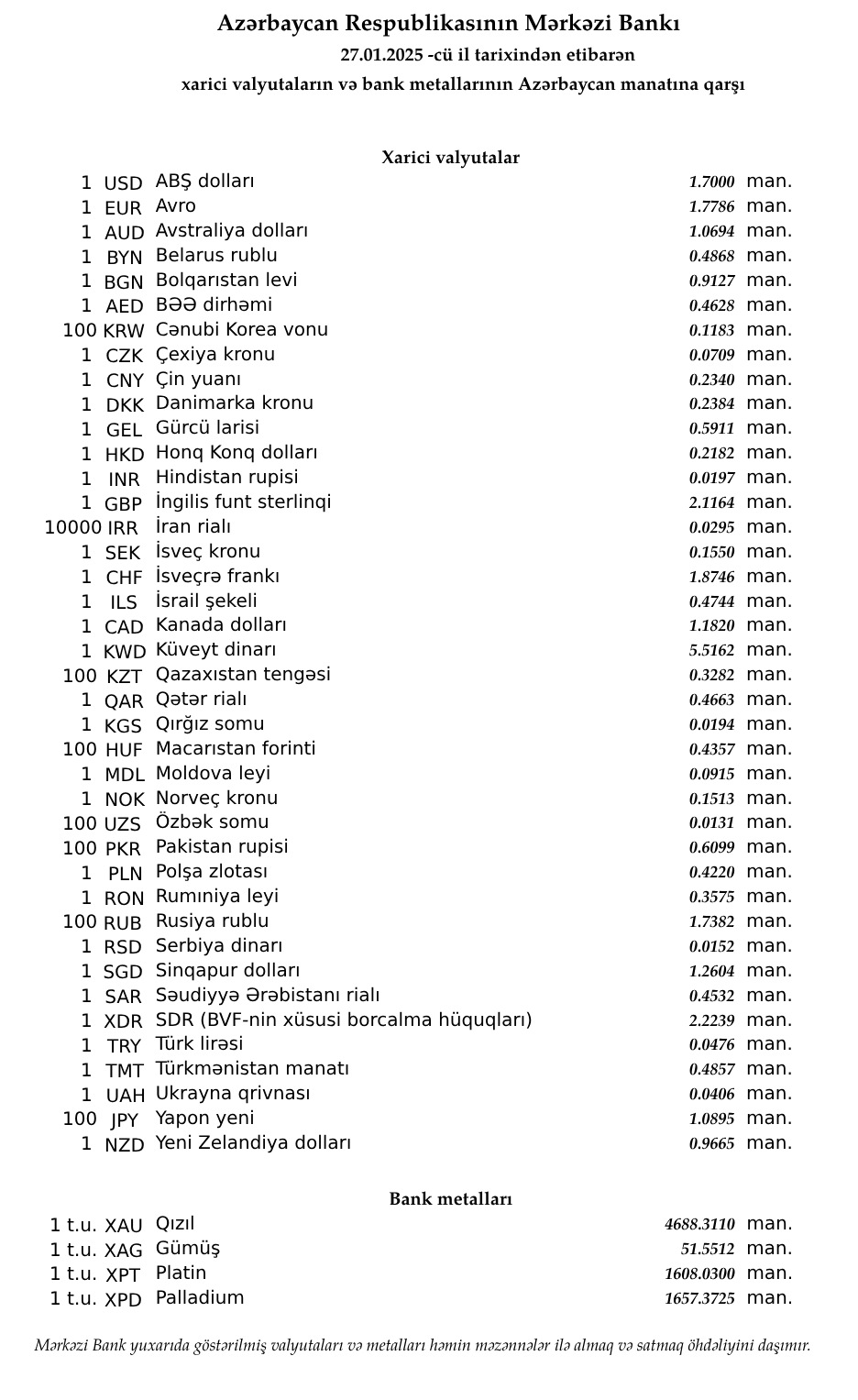 Dolların bazar ertəsi üçün rəsmi məzənnəsi müəyyən olunub
