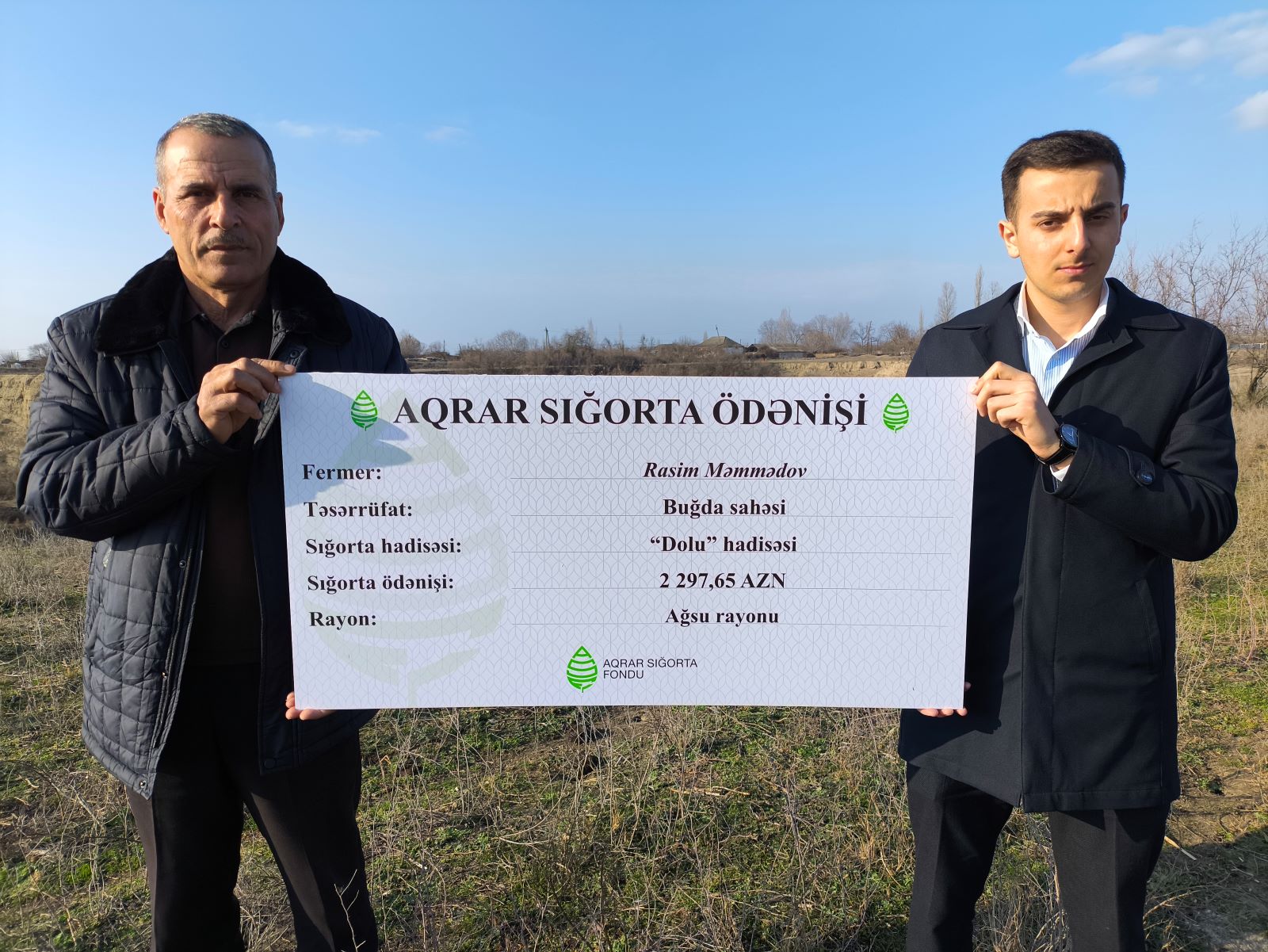 Ağsu rayonunun Kəndoba kəndində fermer Bəhruz Nəbiyevə arpa əkini sahəsinə dolu yağıntısı nəticəsində dəymiş zərərə görə 24 min 41 manat sığorta ödənişi edilib. Eyni zamanda rayonun Abasxanlı kəndində eyni səbəbdən buğda sahəsinə dəymiş zərərə görə fermer Rasim Məmmədov 2 297 manat sığorta ödənilib.