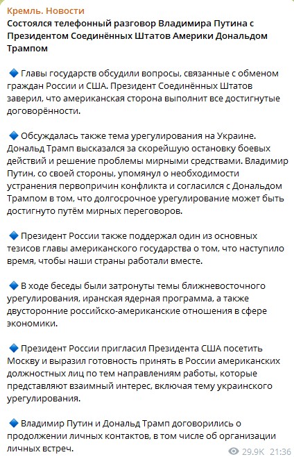- Vladimir Putin və Donald Tramp şəxsi görüşlərin təşkili də daxil olmaqla, şəxsi əlaqələri davam etdirmək barədə razılığa gəliblər.