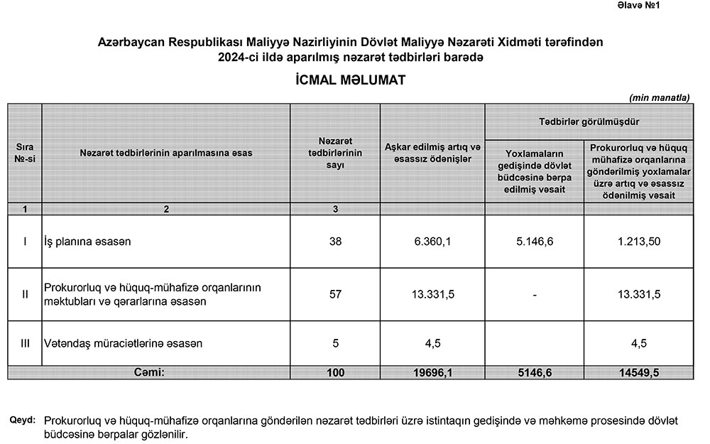 İş planına əsasən isə, Xidmət tərəfindən 2024-cü ildə 38 təşkilatda yoxlamalar aparılıb, bu yoxlamalarla aşkar olunmuş 6 milyon 360,1 min manat məbləğində artıq və əsassız ödənişlərin 5 milyon 146,6 min manat hissəsinin yoxlamaların gedişində və yoxlamalardan sonrakı dövrdə təqsirkar şəxslər tərəfindən dövlət büdcəsinə ödənilməklə, habelə iş və xidmətlərin yerinə yetirilməsi yolu ilə bərpası təmin edilib, həmin nəzarət obyektlərindən 2 təşkilat üzrə aşkar olunmuş 1 milyon 213,5 min manat məbləğində nöqsanlara hüquqi qiymət verilməsi üçün yoxlama materialları Azərbaycan Respublikasının Baş Prokurorluğuna göndərilib (Əlavə №1 və Əlavə №3).