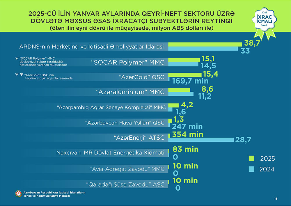 Hesabat dövründə ixrac edilmiş qeyri-neft sektoruna aid malların siyahısında qızıl (21.1 milyon ABŞ dolları) birinci, karbamid (21 milyon ABŞ dolları) ikinci, xurma (19.3 milyon ABŞ dolları) üçüncü yerdə qərarlaşıb.