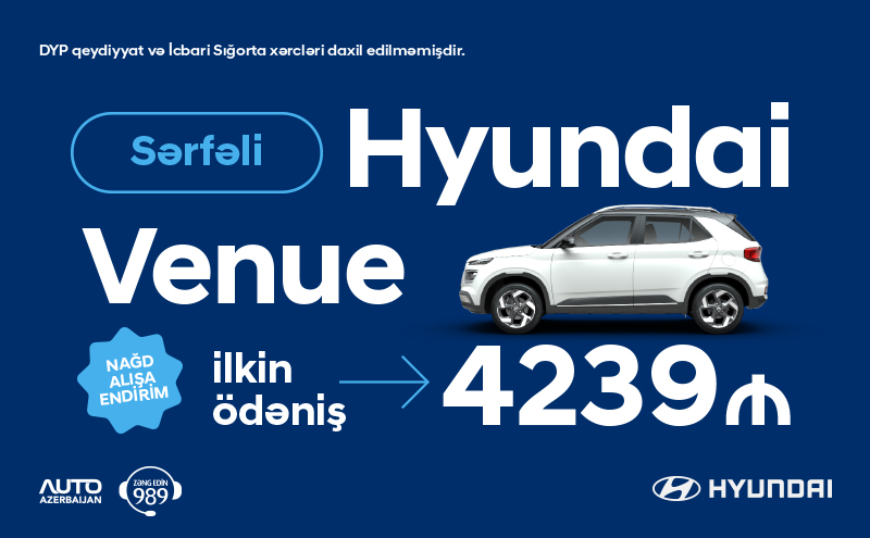 Qeyd: Hyundai i20 və Venue modellərinin ilkin ödənişində DYP və İcbari Sığorta, Hyundai Elantra modelində DYP qeydiyyat xərcləri nəzərə alınmamışdır.