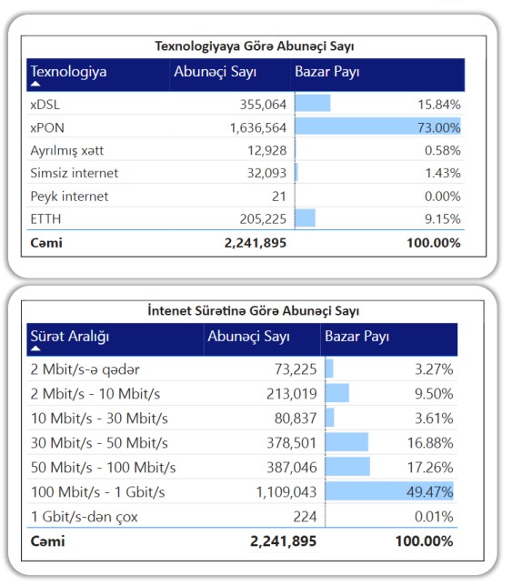 Ölkə üzrə sabit genişzolaqlı internet abunəçiləri üzrə əsas məlumatlar (abunəçilərin sayı, texnoloji bölgü, sürət aralığı) aşağıdakı infoqrafiklərdə göstərilmişdir.