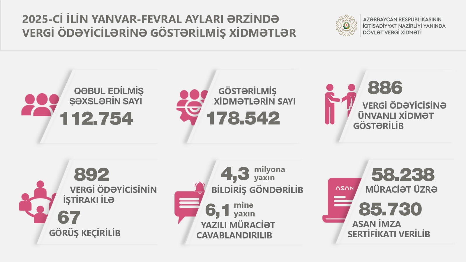 2025-ci ilin yanvar-fevral ayları ərzində vergi ödəyicilərindən daxil olmuş 6,1 minə yaxın yazılı müraciət cavablandırılıb, onlara 4,3 milyona qədər məlumatlandırma xarakterli müxtəlif növ bildirişlər (məktublar) göndərilib. Dövr ərzində 892 vergi ödəyicisinin iştirakı ilə 67 görüş keçirilib, 886 vergi ödəyicisinə ünvanlı xidmət göstərilib.