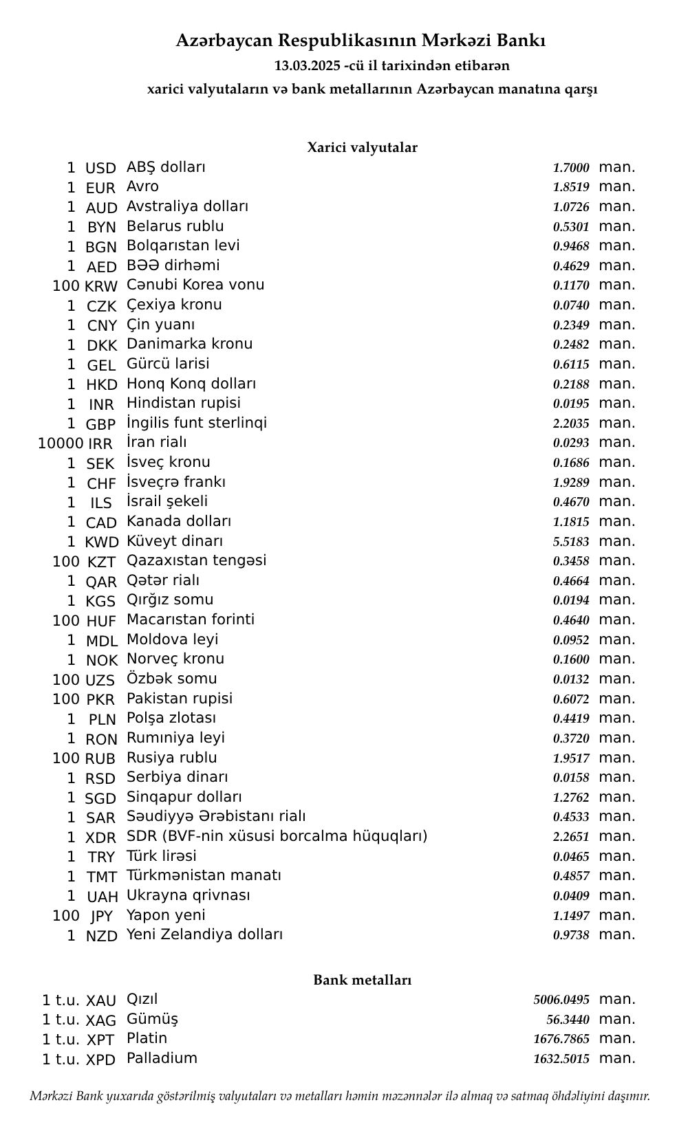 Rəsmi məzənnələr açıqlandı