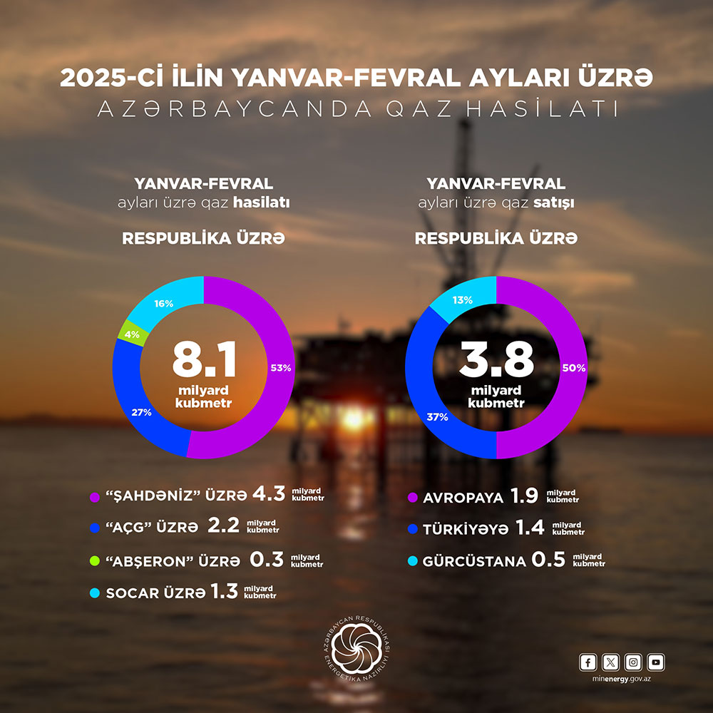 2025-ci ilin yanvar-fevral aylarında ölkədə 8,1 milyard kubmetr təbii qaz hasil edilib. Qazın 2,2 milyard kubmetri “Azəri-Çıraq-Günəşli”nin, 4,3 milyard kubmetri “Şahdəniz”in, 0,3 milyard kubmetri “Abşeron” yatağının, 1,3 milyard kubmetri isə SOCAR-ın payına düşüb.
