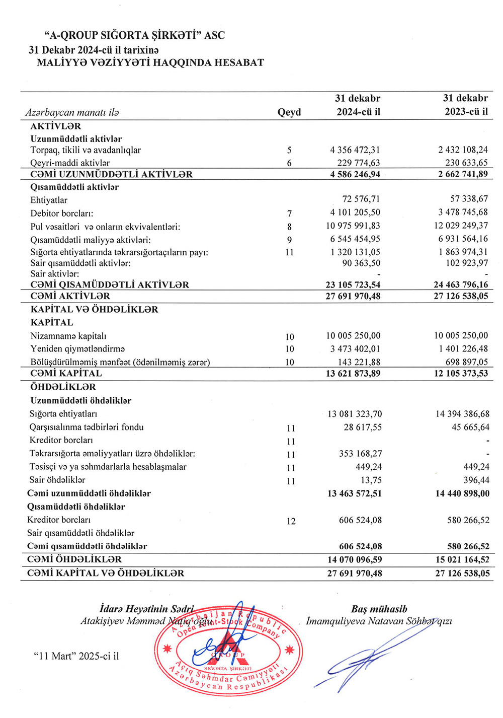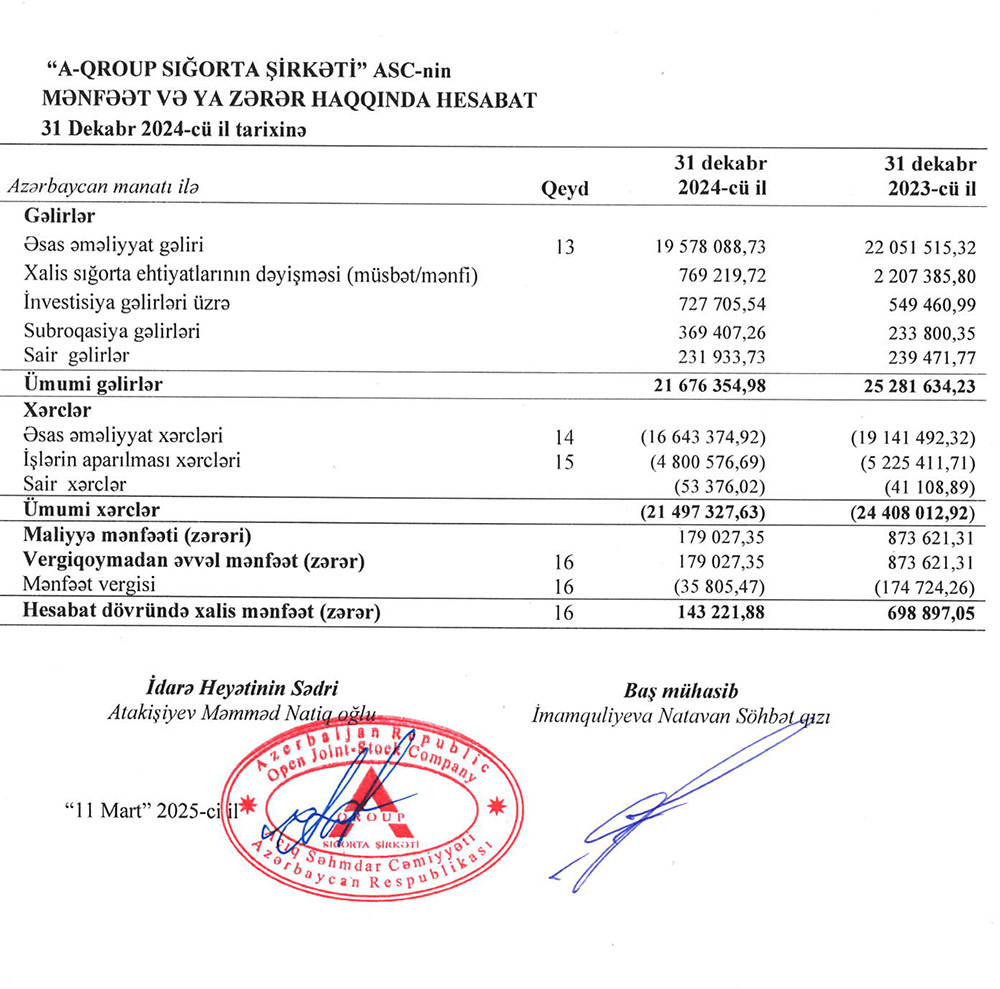 Marja.az “A-Qroup Sığorta Şirkəti”nin audit hesabatına istinadən xəbər verir ki, Şirkətin əməliyyat gəlirləri 2023-ci ildə 25 milyon 282 min manat ikən, 2024-cü ildə 21 milyon 676 min manata düşüb (3 milyon 606 min manat və ya 14,3% azalıb).
