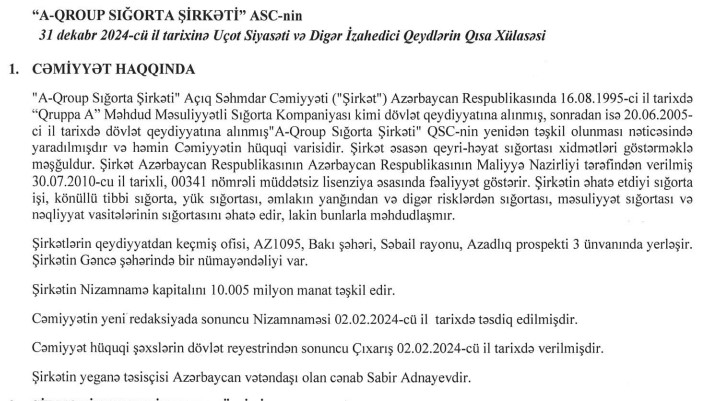 Yeganə təsisçisi Azərbaycan vətəndaşı Sabir Adnayev olan “A-Qroup Sığorta Şirkəti” ASC 2024-cü ili 143 min manat xalis mənfəət ilə başa vurub. Halbuki, Şirkət 2023-cü ili 699 min manat xalis mənfəət ilə bağlamışdı. Beləliklə, “A-Qroup Sığorta Şirkəti”nin xalis mənfəəti 2024-cü ildə 2023-cü illə müqayisədə 4,9 dəfə və ya 556 min manat azalıb.