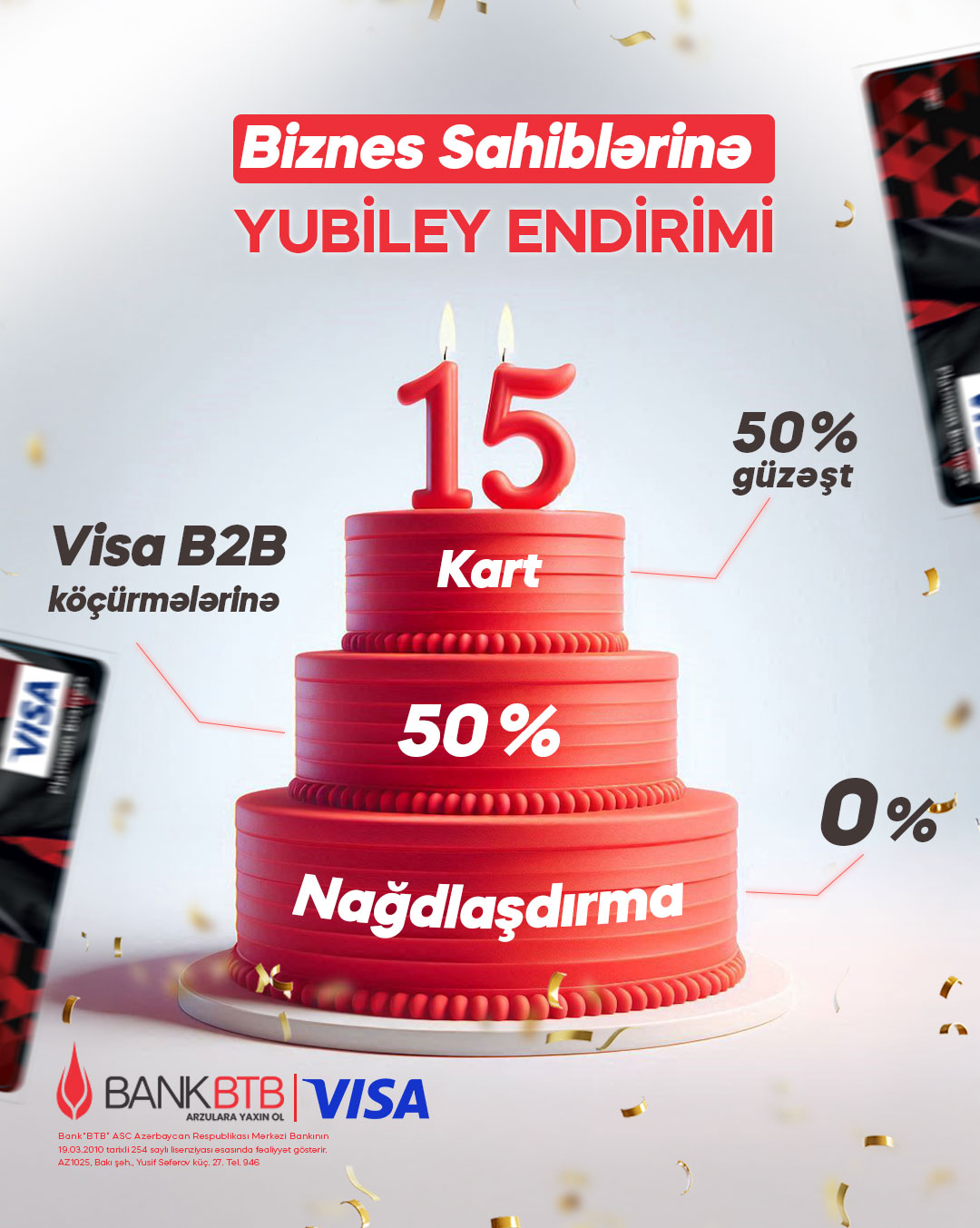 (®) Bank “BTB” ASC 15 illik yubileylə əlaqədar korporativ və biznes müştərilərinə bir necə xidmət üzrə güzəştlər kampaniyası elan edir. Əlavə olaraq müştərilərimiz Visa B2B Connect ödəniş sistemi üzrə möhtəşəm güzəştlərdən faydalanacaqlar.
