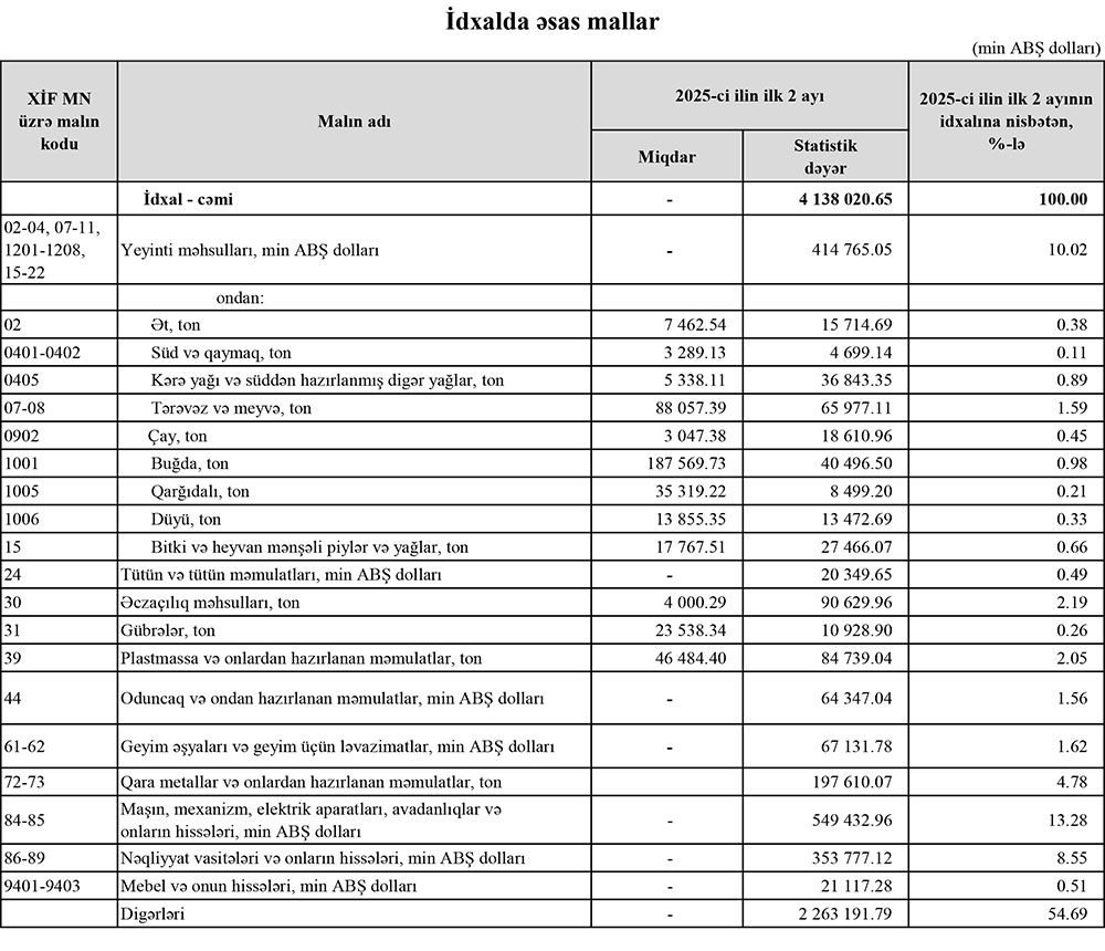 2025-ci ilin yanvar-fevral aylarında (ilk 2 ayda) Azərbaycanın ən çox ixrac və idxal etdiyi mallar.
