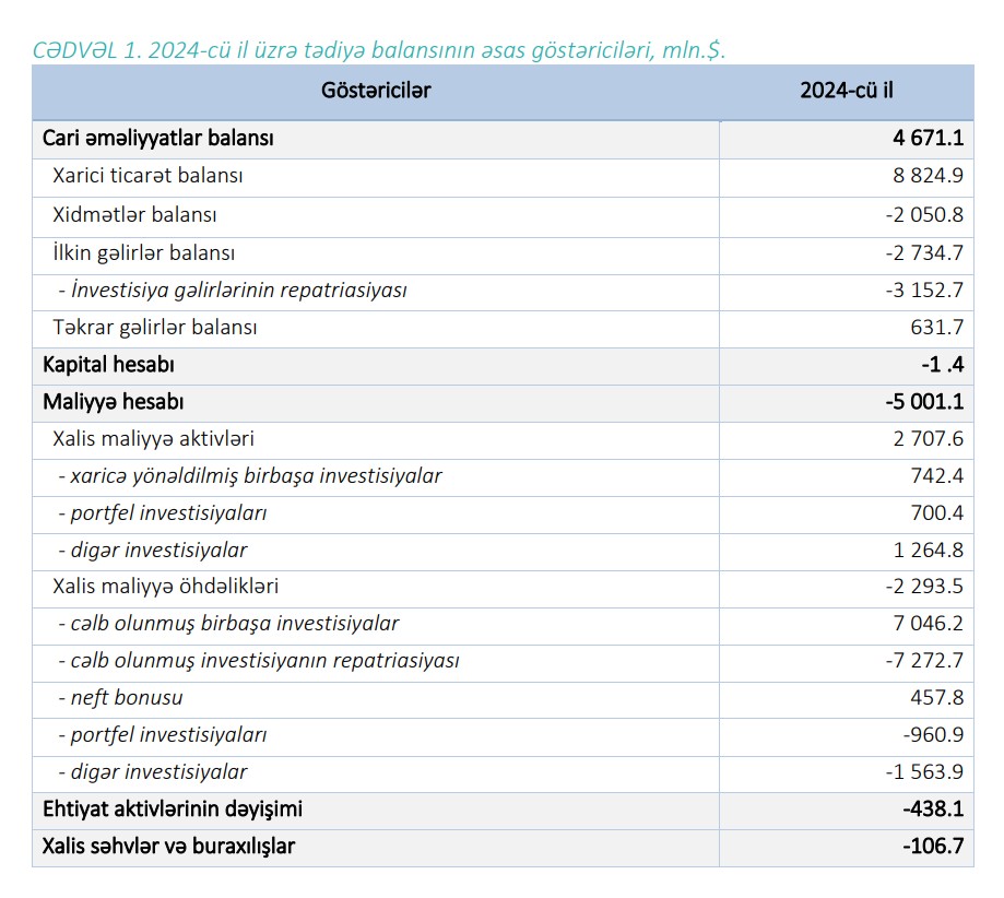 Qeyd edilib ki, 2024-cü il üzrə cari əməliyyatlar hesabının profisiti 4.7 mlrd.$ və ya ÜDM-in 6.3%-ni təşkil etmişdir (2023-cü il üzrə 8.3 mlrd.$ profisit olmuşdur). Neft-qaz sektoru üzrə CƏB-in profisiti ötən ilə nəzərən (ö.i.n.) 11.9% daralaraq 15.1 mlrd.$, qeyri-neft-qazsektoru üzrə CƏBin kəsiri isə 18.5% artaraq 10.4 mlrd.$ məbləğində olmuşdur.